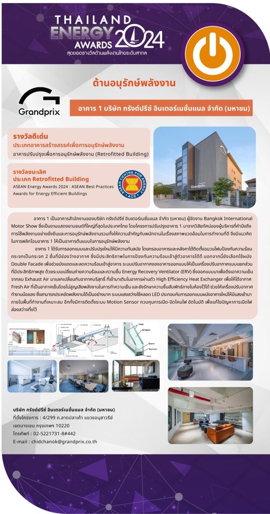 บริษัท กรังด์ปรีซ์ อินเตอร์เนชั่นแนล จำกัด (มหาชน) โดย นายพีระพงศ์ เอี่ยมลำเนา ประธานเจ้าหน้าที่บริหาร เข้ารับรางวัลดีเด่น ประเภทอาคารสร้างสรรค์เพื่อการอนุรักษ์พลังงาน สาขา อาคารปรับปรุงเพื่อการอนุรักษ์พลังงาน (Retrofitted Building)