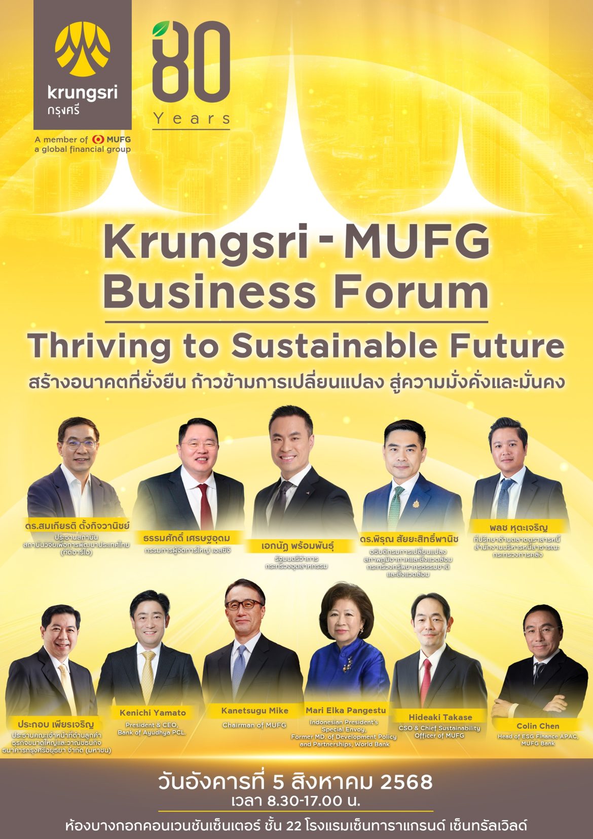กรุงศรี (ธนาคารกรุงศรีอยุธยา จำกัด (มหาชน)) ขอเรียนเชิญผู้ประกอบการ นักลงทุน และผู้สนใจเข้าร่วมงานสัมมนายิ่งใหญ่ประจำปี “Krungsri-MUFG Business Forum: Thriving to Sustainable Future” ในวันอังคารที่ 5 สิงหาคม 2568 ณ ห้องบางกอกคอนเวนชันเซ็นเตอร์ ชั้น 22 โรงแรมเซ็นทาราแกรนด์ เซ็นทรัลเวิลด์