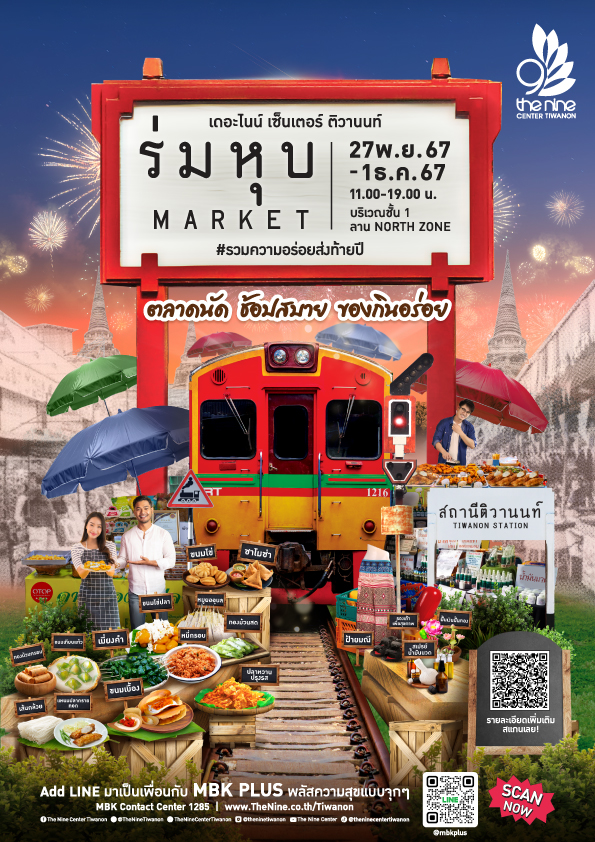 เดอะไนน์ เซ็นเตอร์ ติวานนท์ ศูนย์การค้าในเครือเอ็ม บี เค ชวนชาวปทุมธานี กลับมาช้อปกับงาน ตลาดนัด ช้อปสบาย ของกินอร่อยกันอีกครั้ง ในงาน ร่มหุบ MARKET #รวมความอร่อยส่งท้ายปี พร้อมเอาของกิน ของอร่อย ไม่ว่าจะเป็นหมี่กรอบพรรณิการ์ ปลาหวานปรุงรสจากเป็นเอกอร่อยเหาะ ชมดีหมูยออุบล ทองม้วนสด ขนมเทียนแก้วจากลุงตุ๊ แหนมปลากรายทอด เส้นกล้วยจากตั้งใจธรรม ดาวเรืองไข่ปลา อิ่มเพรชขนมเบื้อง เมี่ยงสามคำ ซาโมซา สมุนไพรแก้วภูผา สเปรย์น้ำมันนวด รองเท้าเพื่อสุขภาพและดอกไม้ประดิษฐ์จากดินไทย