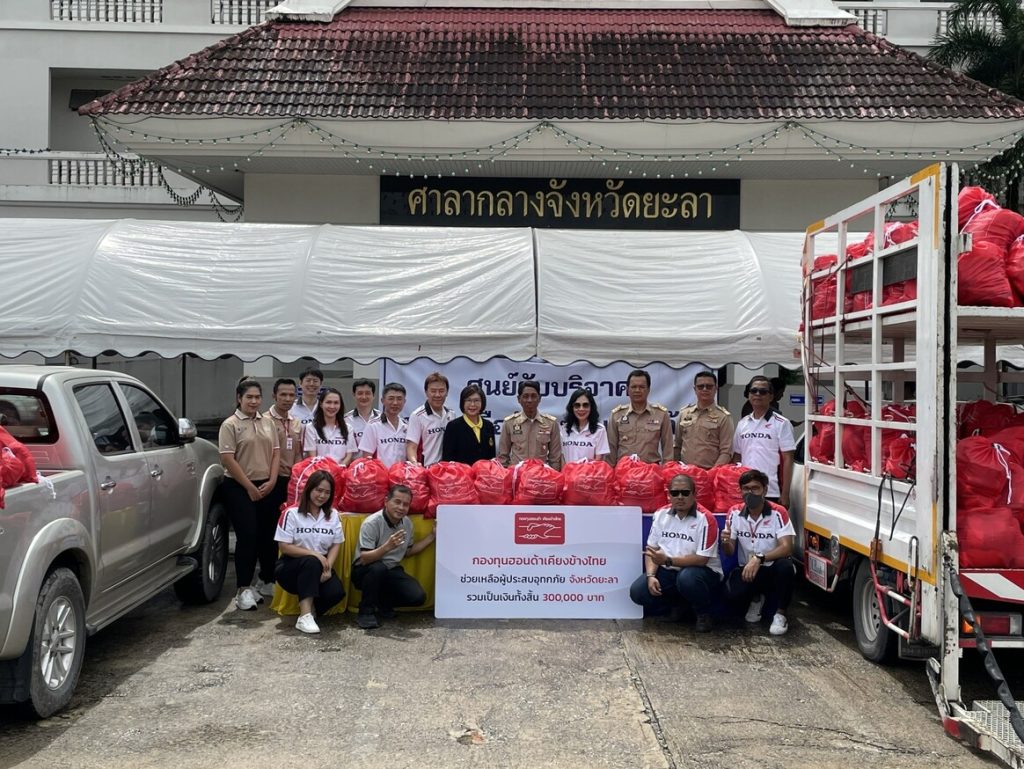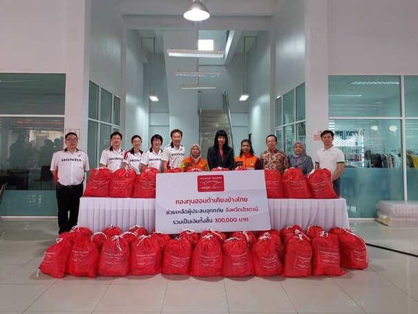 กองทุนฮอนด้าเคียงข้างไทย ภายใต้มูลนิธิฮอนด้าประเทศไทย ผนึกกำลังตัวแทนผู้จำหน่ายรถยนต์และรถจักรยานยนต์ฮอนด้า ร่วมใจช่วยเหลือผู้ประสบอุทกภัยในพื้นภาคใต้ 4 จังหวัด ได้แก่ สงขลา ยะลา ปัตตานี และนราธิวาส โดยส่งมอบถุงยังชีพไปแล้วกว่า 2,400 ถุง รวมมูลค่าความช่วยเหลือทั้งสิ้น 1.2 ล้านบาท และจะทยอยเข้าช่วยเหลืออย่างต่อเนื่องในจังหวัดชุมพร สุราษฎร์ธานี นครศรีธรรมราช และพื้นที่ประสบอุทกภัยและได้รับความเดือดร้อนต่อไป