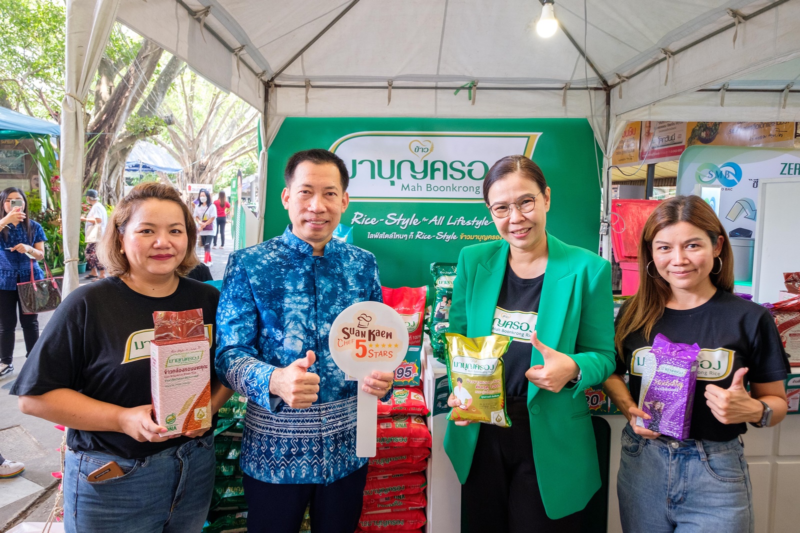 นางสาวมัลลิกา บุระขันธ์ ผู้อำนวยการฝ่ายบริหารการตลาด บริษัท พี อาร์ จี คอร์ปอเรชั่น จำกัด (มหาชน) (ที่ 3 จากซ้าย) ผู้บริหารกลุ่มธุรกิจในเครือข้าวมาบุญครอง ให้การต้อนรับนายอภิชัย อร่ามศรี รองผู้ว่าราชการจังหวัดนนทบุรี (ที่ 2 จากซ้าย) ที่ให้เกียรติเยี่ยมชมบูธข้าวมาบุญครอง ที่นำมาแนะนำและจำหน่ายในราคาสุดพิเศษ ภายในงาน “Suan Kaew Food Festi-Wat สวนแก้วรวมพลังวัฒนธรรมอาหาร” โดยข้าวมาบุญครอง ร่วมเป็นผู้สนับสนุนการจัดงานอย่างเป็นทางการ เพื่อส่งเสริมผลิตผลทางการเกษตรของวัดสวนแก้ว นำมาต่อยอดให้มีมูลค่ามากยิ่งขึ้น และสนับสนุนผู้ประกอบการร้านอาหารรายย่อย ให้มีพื้นที่ในการจำหน่ายอาหาร ณ วัดสวนแก้ว นนทบุรี เมื่อเร็ว ๆ นี้