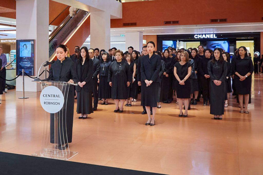 โดยมีคณะผู้บริหารกลุ่มห้างสรรพสินค้าเซ็นทรัล ในเครือเซ็นทรัล รีเทล นำโดย คุณณัฐธีรา บุญศรี ประธานเจ้าหน้าที่บริหาร ให้เกียรติเป็นประธานในพิธี ร่วมด้วย คุณธาพิดา นรพัลลภ กรรมการผู้จัดการกลุ่มบริหารสินค้าออมนิชาแนล คุณรวิศรา จิราธิวัฒน์ ประธานเจ้าหน้าที่บริหารกลุ่มการตลาด และพนักงาน ร่วมประกอบพิธีน้อมถวายความอาลัย และยืนสงบนิ่งเป็นเวลา 93 วินาที เพื่อรำลึกในพระมหากรุณาธิคุณอันหาที่สุดมิได้ โดยภายหลังการยืนสงบนิ่ง ประธานในพิธี และตัวแทนผู้บริหาร ได้ร่วมวางพวงมาลัยถวายความอาลัยเบื้องหน้าพระฉายาลักษณ์ เพื่อแสดงความอาลัยอย่างสุดซึ้ง พร้อมน้อมสำนึกในพระมหากรุณาธิคุณอันหาที่สุดมิได้ ที่ทรงมีต่อพสกนิกรชาวไทยและแผ่นดินไทยตลอดพระชนม์ชีพ