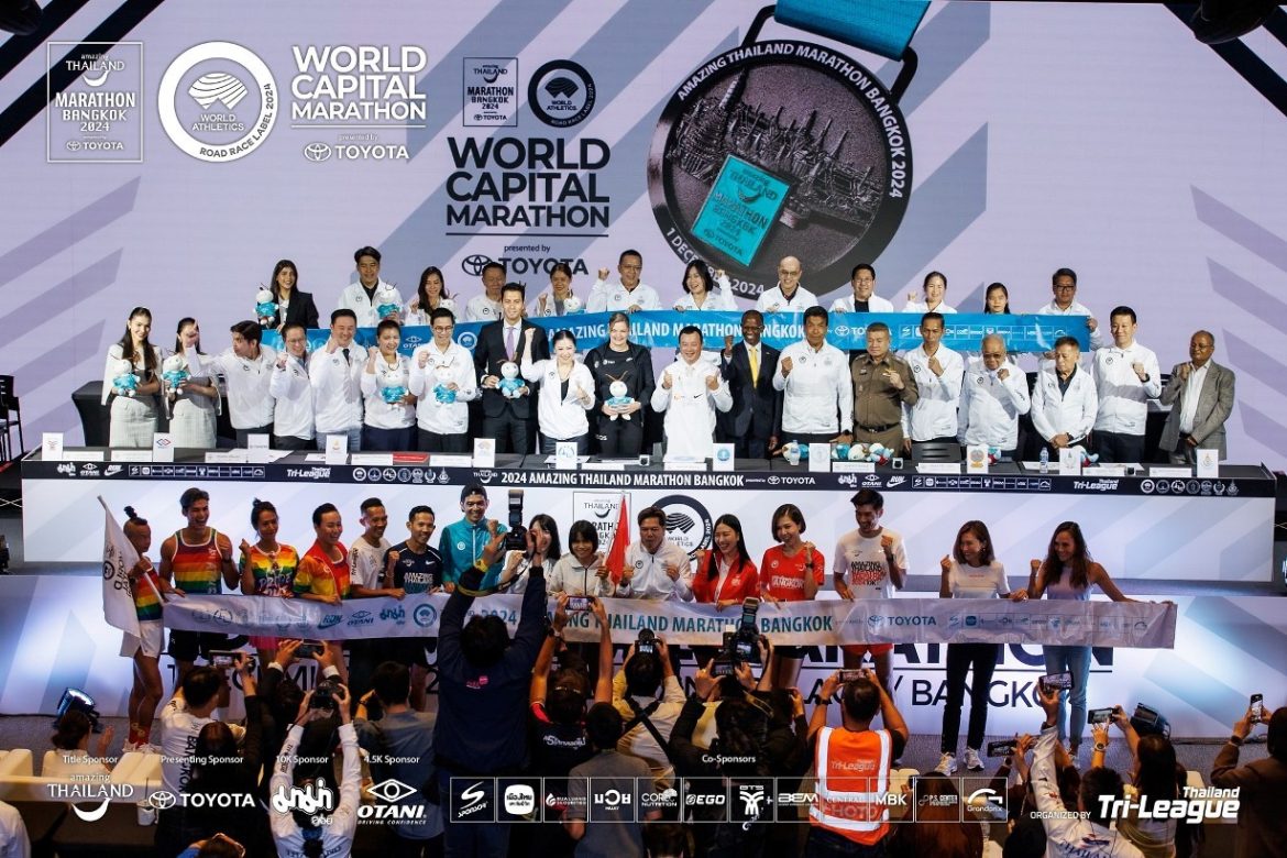 เมื่อวันที่ 24 ตุลาคม 2567 ณ Toyota Alive บางนา กม.3 นายสรวงศ์เทียนทอง รัฐมนตรีว่าการกระทรวงการท่องเที่ยวและกีฬา ได้เดินทางมาเป็นประธานแถลงข่าวการจัดการแข่งขันวิ่งมาราธอนส่งเสริมการท่องเที่ยวระดับโลก รายการ “อะเมซิ่งไทยแลนด์มาราธอนแบงค็อก พรีเซ็นต์บายโตโยต้า ครั้งที่ 7” ท่ามกลางแขกผู้มีเกียรติ ทั้งนางสาวฐาปนีย์เกียรติไพบูลย์ ผู้ว่าการการท่องเที่ยวแห่งประเทศไทย นายชัชชาติสิทธิพันธุ์ ผู้ว่าราชการกรุงเทพมหานคร, มร.คิปทิเนสส์ลินด์ซีย์คิมโวเล่ เอกอัครราชทูตสาธารณรัฐเคนยาประจำประเทศไทย, มร.เอเลซิโอปุนชี ผู้อำนวยการอาวุโสสมาคมกรีฑาโลก, พลตำรวจตรีธวัชวงศ์สง่า รองผู้บัญชาการตำรวจนครบาล, นายศานนท์หวังสร้างบุญ รองผู้ว่าราชการกรุงเทพมหานคร, พล... สุรพงษ์อาริยะมงคล อุปนายกและเลขาธิการสมาคมกีฬากรีฑาแห่งประเทศไทยฯ, นายยุธยาจีนหีตผู้อำนวยการฝ่ายธุรกิจกีฬา การกีฬาแห่งประเทศไทย, นายณัทธรศรีนิเวศน์ ผู้ช่วยกรรมการผู้จัดการใหญ่ บริษัท โตโยต้า มอเตอร์ ประเทศไทย จำกัด, นายกอบเกียรติแสงวนิชย์ ผู้อำนวยการจัดการแข่งขัน, ผู้สนับสนุนภาคเอกชน, สื่อมวลชน และเหล่านักวิ่งที่มาร่วมงานอย่างคับคั่ง โดยในปีนี้ คณะกรรมการจัดการแข่งขันฯ แอบทำบิ๊กเซอร์ไพรส์ด้วยการเชิญตำนานนักวิ่งมาราธอนโลก ดีกรีแชมป์โอลิมปิก 2 สมัยชาวเคนยา เอเลียดคิปโชเก้ และทีมวิ่งอันดับหนึ่งของโลก NN Running Team มาเป็น “ทูตทางการท่องเที่ยวและกีฬาอย่างเป็นทางการ” นอกจากนี้ยังเชิญคิปโชเก้มาร่วมวิ่งและทำกิจกรรมต่างๆ มากมายในงานนี้อีกด้วย