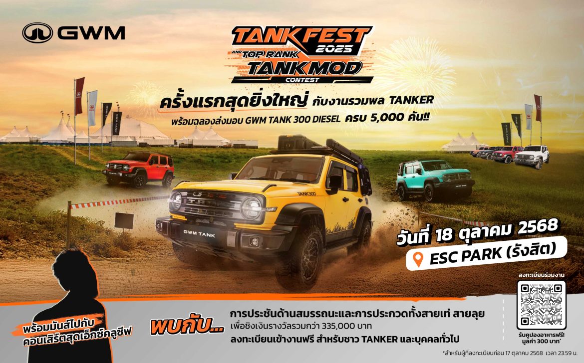 GWM (Thailand) ยกระดับสู่การเป็นแบรนด์รถยนต์ที่มีผลิตภัณฑ์ครอบคลุมทุกประเภทพลังงานที่ตอบสนองความต้องการของผู้ใช้งานทั่วทุกมุมโลก ด้วยแนวคิด “ครอบคลุมทุกการใช้งาน (All Scenarios) ด้วยผลิตภัณฑ์ที่ครอบคลุมทุกพลังงาน (All Powertrains) สู่การตอบสนองทุกกลุ่มผู้ใช้งานอย่างแท้จริง (All Users)” จากความสำเร็จของตระกูลรถออฟโรดทั้ง GWM TANK 300 และ GWM TANK 500 ที่ได้รับการตอบรับอย่างล้นหลามตั้งแต่เปิดตัว สู่จำนวน TANKER หรือผู้ใช้จริงที่เติบโตอย่างก้าวกระโดด เพื่อเป็นการขอบคุณลูกค้าชาวไทยทั่วประเทศและเนื่องในโอกาสเฉลิมฉลองการส่งมอบ NEW GWM TANK 300 DIESEL ครบ 5,000 คัน ปลุกกระแสคนรักรถ GWM TANK และการตกแต่ง รวมถึงเอาใจสายซิ่ง สายลุย และสายโหด GWM จึงจัดมหกรรมเฟสติวัลสุดยิ่งใหญ่ “TANK FEST 2025 and TOP RANK TANK MOD” ครั้งแรกในไทย เนรมิตพื้นที่ขนาดมหึมาเกือบ 50,000 ตารางเมตร ให้เป็นลานกิจกรรมสุดเร้าใจ เปิดพื้นที่สำหรับแฟนพันธุ์แท้ GWM TANK ทั้งสายออฟโรดและสายชิลล์ผู้ที่ชื่นชอบการแต่งรถให้เป็นพื้นที่ได้ปล่อยของ ปลดปล่อยจินตนาการ และความคิดสร้างสรรค์ได้อย่างไร้ขีดจำกัด ผ่านกิจกรรมความสนุกที่อัดแน่นในทุกตารางนิ้ว ทั้งเวทีประกวดและจัดแสดงรถแต่ง การแข่งขันการขับขี่ออฟโรดสุดครีเอทีฟ สนามเทสต์สมรรถนะ GWM TANK กิจกรรมความสนุกอีกมากมาย พร้อมรับของที่ระลึกติดไม้ติดมือกลับบ้าน การันตีความอร่อยตลอดวันด้วยสตรีทฟู้ดกับ Food truck เจ้าดังจำนวนมาก รับชมการแสดงดนตรีคลอเคล้าบรรยากาศจากวงดนตรีชื่อดังตั้งแต่เช้าจรดเย็น พร้อมตบท้ายด้วยคอนเสิร์ตจากศิลปินชื่อดังยามค่ำคืน สำหรับผู้ที่สนใจทุกคนเข้าร่วมงานฟรีแบบไม่มีค่าใช้จ่าย จะมาคนเดียว มาเป็นคู่ เป็นแก๊งค์ หรือยกขบวนทั้งครอบครัว ปักหมุดแล้วมาเจอกัน วันเสาร์ที่ 18 ตุลาคม 2568 ณ ESC Park รังสิต จ.ปทุมธานี และวันอาทิตย์ที่ 19 ตุลาคม 2568 สำหรับผู้ที่สนใจทดลองขับ GWM