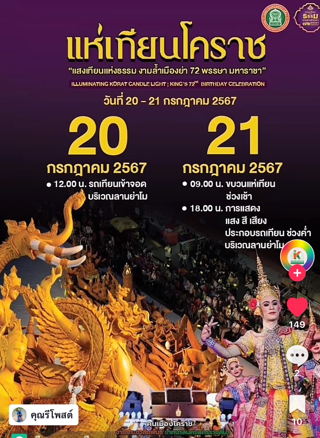 งานประเพณีแห่เทียนพรรษา ประจำปี 2567 “แสงเทียนแห่งธรรม งามล้ำเมืองย่า 72 พรรษา มหาราชา” Illuminating Korat Candle Light : King’s 72 birthday Celebration 20-21 กรกฎาคม 2567 ณ ลานอนุสาวรีย์ท้าวสุรนารี สวนสุรนารี สวนเมืองทอง และสวนอนุสรณ์สถาน