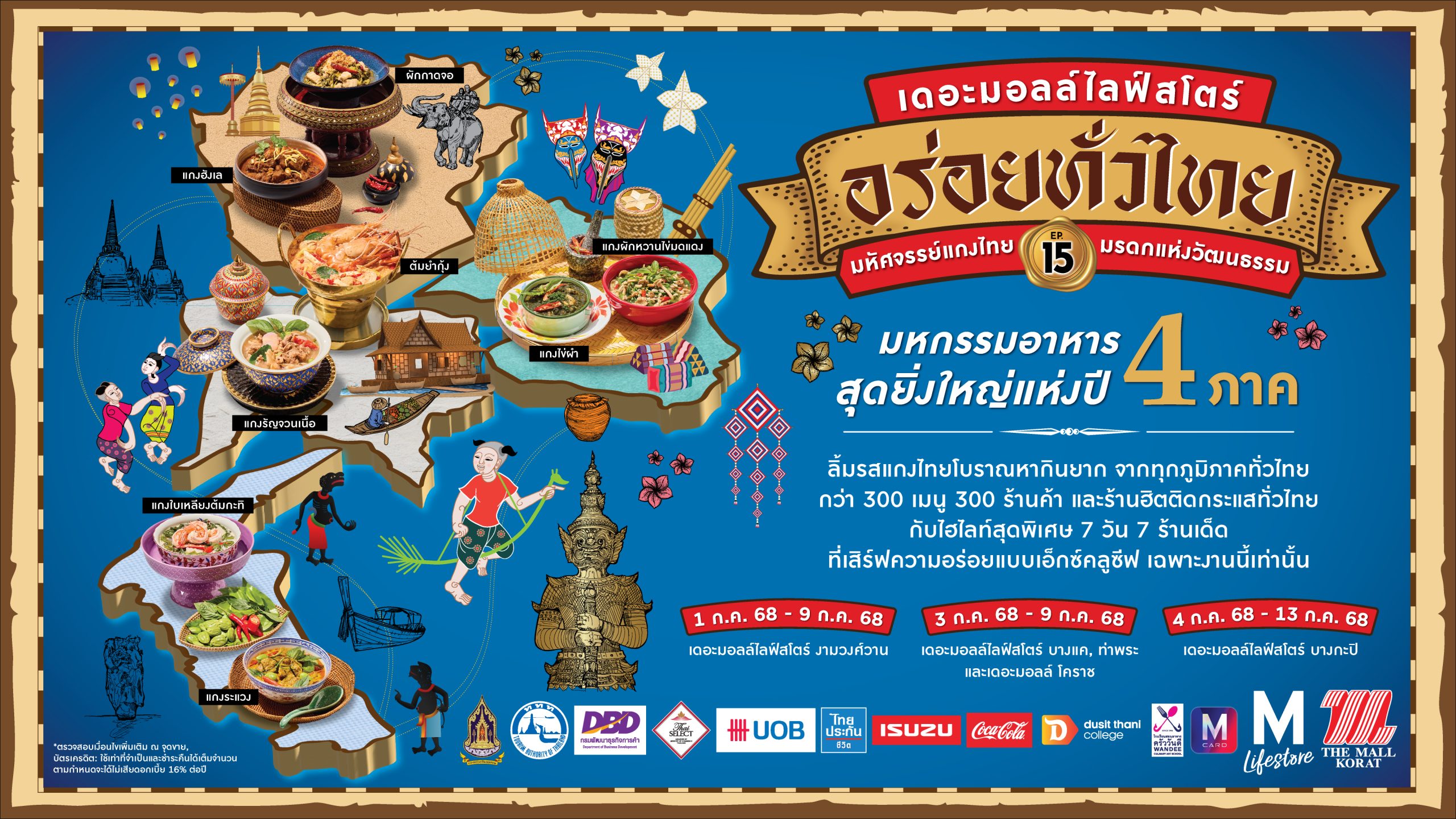เดอะมอลล์ไลฟ์สโตร์ ร่วมกับ กระทรวงวัฒนธรรม, การท่องเที่ยวแห่งประเทศไทย กระทรวงการท่องเที่ยวและกีฬา, ธนาคารยูโอบี จำกัด (มหาชน),  บริษัท ไทยประกันชีวิต จำกัด (มหาชน), บริษัท ไทยน้ำทิพย์ คอร์ปอเรชั่น จำกัด และบริษัท ตรีเพชรอีซูซุเซลส์ จำกัด ชวนเที่ยวงาน “เดอะมอลล์ไลฟ์สโตร์ อร่อยทั่วไทย ครั้งที่ 15”  ร่วมสืบสานเอกลักษณ์วัฒนธรรมด้านอาหารของไทย ครั้งแรกของ “แกงไทย” หาทานยากจากทั่วทุกภูมิภาคมากกว่า 3,000 เมนู 300 ร้านค้า พร้อมเฟ้นหาผู้ชนะจาก “ศึกชิงแชมป์ต้มยำกุ้ง 2025” ตั้งแต่วันที่ 1-13 กรกฎาคม 2568 ที่ เดอะมอลล์ไลฟ์สโตร์ งามวงศ์วาน, บางแค, ท่าพระ, บางกะปิ และเดอะมอลล์ โคราช