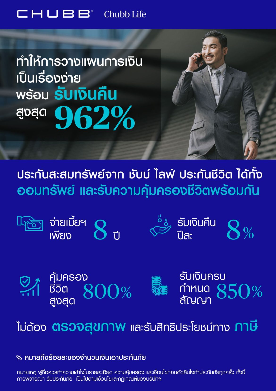 ลูกค้าสามารถศึกษารายละเอียดผลิตภัณฑ์เพิ่มเติมได้ที่ https://www.chubb.com/th-th/personal/smart-savings-15-8-insurance.html