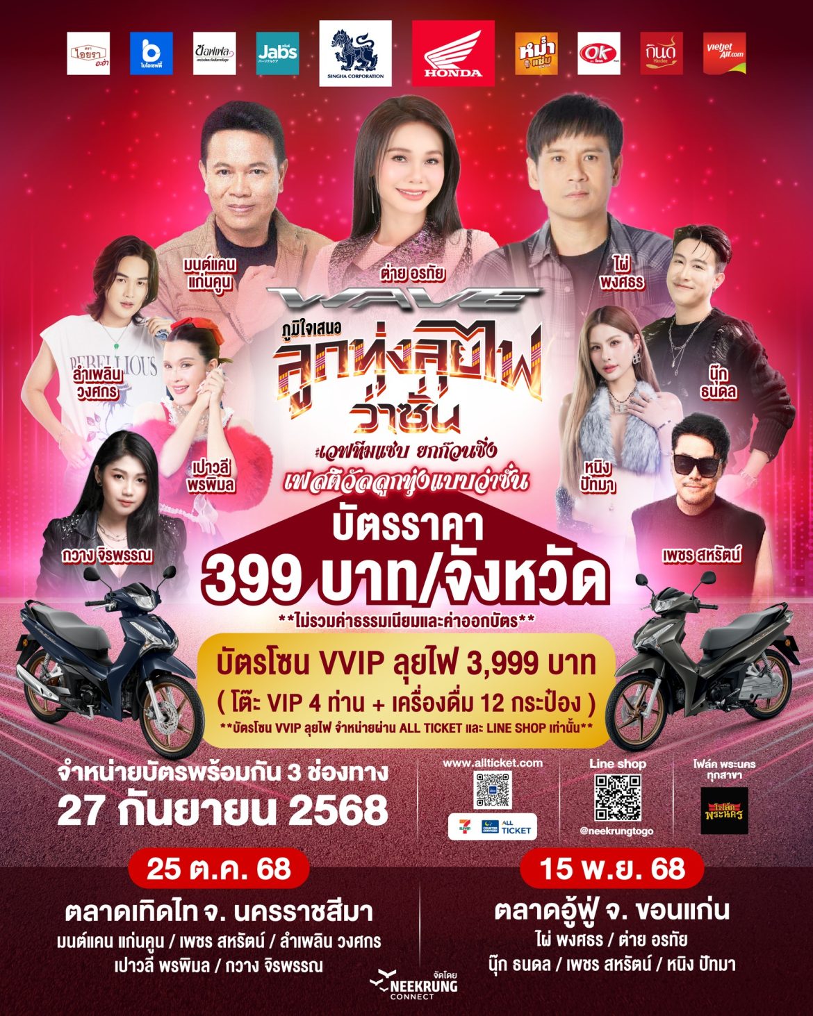 เฉียงเหนือที่เข้าร่วมกิจกรรม และสำหรับลูกค้าทั่วไปสามารถสามารถซื้อบัตรได้ที่ www.allticket.com หรือ Line shop @neekrungtogo และร้านโฟล์ค พระนคร ทุกสาขา บัตรเข้าชมราคา 399 บาท/จังหวัด และสำหรับบัตรโซน VVIP ลุยไฟราคา 3,999 บาท (โต๊ะ VIP 4 ท่าน รวมเครื่องดื่ม 12 กระป๋อง) ขอเชิญชวนพี่น้องมาม่วนซื่นนำกันในงานนี้ อย่าพลาดเด้อ