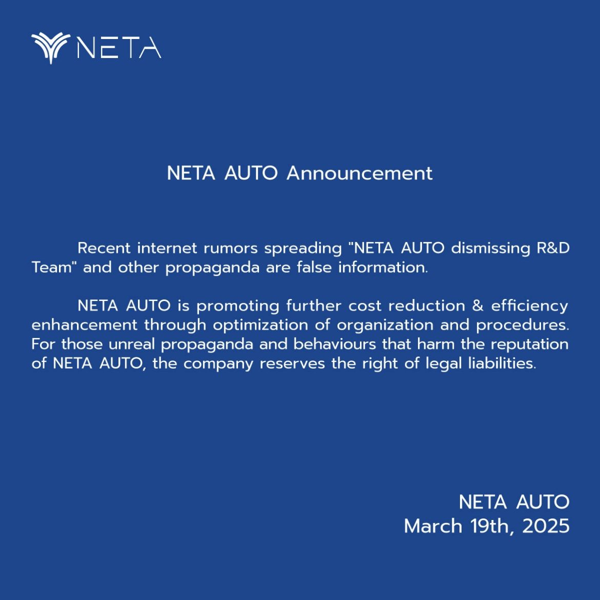 เราขอขอบคุณผู้บริโภคและสื่อมวลชนทุกท่านที่ให้ความสนใจและสนับสนุนแบรนด์ NETA ในประเทศไทย และเรายืนยันที่จะดำเนินธุรกิจและมุ่งมั่นพัฒนาผลิตภัณฑ์ พร้อมทั้งเทคโนโลยีที่สามารถเป็นเจ้าของได้สำหรับคนไทย ซึ่งสอดคล้องกับพันธกิจหลักของ NETA ในการสร้างการเข้าถึงเทคโนโลยีอย่างเท่าเทียมกันสำหรับทุกคน หรือ “Tech For All”