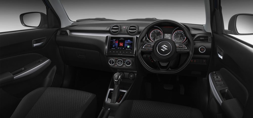 SUZUKI SWIFT สปอร์ตแฮทช์แบ็กยอดนิยมของคนไทย สร้างยอดขายเป็นอันดับหนึ่งของซูซูกิมาอย่างต่อเนื่อง ห้องโดยสารสีดำตกแต่งด้วยวัสดุสีเงินสไตล์สปอร์ต จอระบบสัมผัสขนาด 8 นิ้ว  พร้อมฟังก์ชันเอนเตอร์เทนเมนท์ครบครัน รองรับการเชื่อมต่อทั้ง Apple CarPlay, Android Auto และ Bluetooth และเชื่อมต่อสมาร์ทโฟน เติมเต็มความบันเทิงในการขับขี่ ทำให้ไม่พลาดทุกการติดต่อตลอดการเดินทาง มาพร้อมเครื่องยนต์รหัส K12M ขนาด 1.2 ลิตร หัวฉีดคู่ DUALJET ช่วยลดมลพิษและประหยัดน้ำมันถึง 23 กิโลเมตรต่อลิตร ในราคาเริ่มต้นเพียง 567,000 บาท