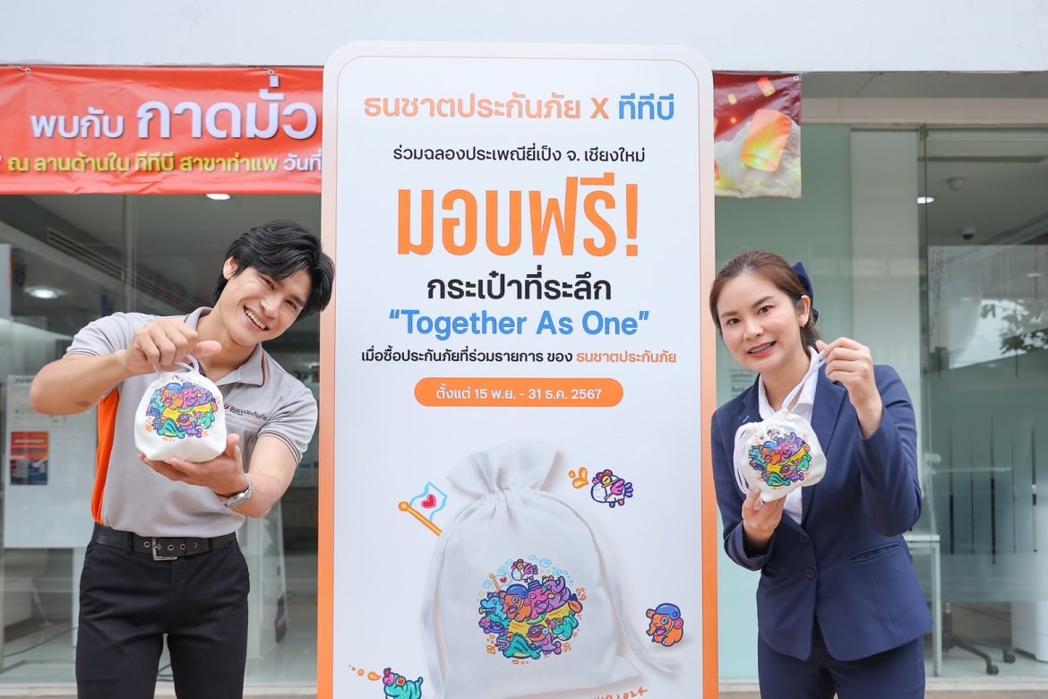โปรโมชันรับเทศกาลงานประเพณียี่เป็งของชาวล้านนา และต้อนรับเทศกาลท่องเที่ยวฤดูหนาวปลายปี เมื่อซื้อผลิตภัณฑ์ประกันภัยของธนชาตประกันภัย ที่มีให้เลือกทุกความคุ้มครอง ทั้งประกันภัยรถยนต์, ประกันภัยรถยนต์ไฟฟ้า, ประกันภัยอุบัติเหตุส่วนบุคคล, ประกันภัยเดินทางต่างประเทศ และประกันบ้าน ทีทีบี โฮม การ์ด ช่องทางจำหน่ายผ่านทีทีบี สาขาในจังหวัดเชียงใหม่ ลำพูน ลำปาง เชียงราย แพร่ น่าน และพะเยา รับฟรี! กระเป๋าผ้าแคนวาส คอลเลกชัน TOGETHER AS ONE รุ่นลิมิติดที่ออกแบบลวดลายการ์ตูนช้างเชียงใหม่และเพื่อนสัตว์สุดคิวท์ สื่อความหมายความร่วมมือร่วมใจช่วยเหลือและดูแลกันเพื่ออนาคตที่สดใส โดยศิลปินชาวเชียงใหม่-อนุกูล เหมาลา ผู้ที่สร้างสรรค์ผลงานเพื่อให้ทุกคนมีความสุขและสนุกกับเมืองเชียงใหม่ผ่านการวาดภาพ