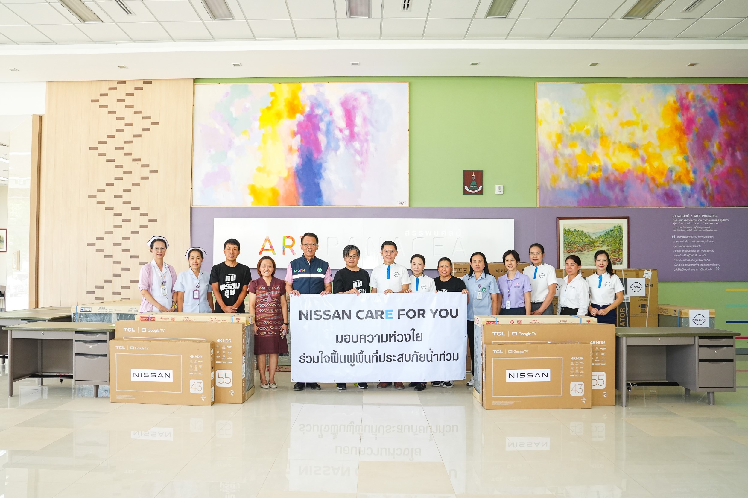 ทีมผู้บริหารนิสสัน ประเทศไทย นำโดย ทาคาอากิ ยานางิรองประธานอาวุโส นิสสัน ประเทศไทย พร้อมด้วย วิชัย สินไชยกุลกรรมการผู้จัดการ บริษัท สยามนิสสันเมืองน่าน จำกัด ผู้จำหน่ายนิสสันในพื้นที่จังหวัดน่าน ร่วมกันส่งมอบอุปกรณ์สำนักงาน และอุปกรณ์การแพทย์สำหรับใช้ในหอผู้ป่วย ให้แก่โรงพยาบาลจังหวัดน่าน และมอบอุปกรณ์การเรียนการสอนให้แก่ โรงเรียนไทยรัฐวิทยา 45 บ้านดอนแท่น อำเภอเวียงสา จังหวัดน่าน เพื่อช่วยให้โรงพยาบาล และโรงเรียนดังกล่าวสามารถกลับมาให้บริการได้อย่างเต็มประสิทธิภาพ และเกิดความต่อเนื่อง