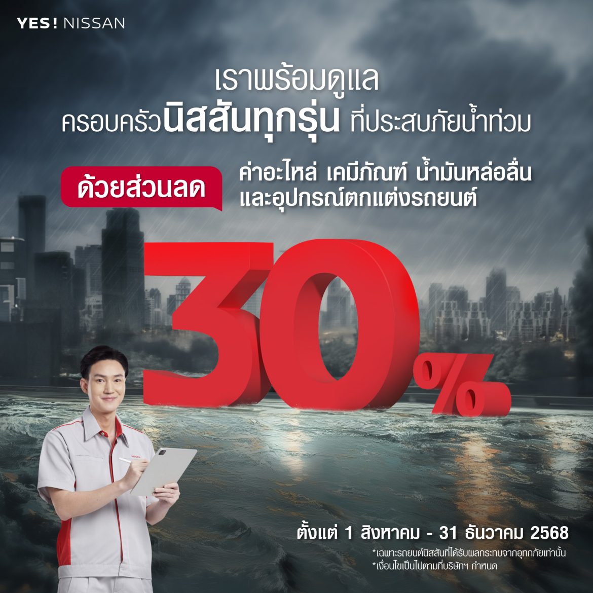 แคมเปญนี้จัดขึ้นเพื่อช่วยเหลือลูกค้านิสสันที่ได้รับความเสียหายจากน้ำท่วม และต้องรับผิดชอบค่าใช้จ่ายในการซ่อมแซมรถยนต์ด้วยตนเอง เนื่องจากความเสียหายดังกล่าวไม่อยู่ในความคุ้มครองของบริษัทประกันภัย โดยแคมเปญจะดำเนินตั้งแต่วันที่ 1 สิงหาคม ถึง 31 ธันวาคม 2568 ลูกค้าที่มีสิทธิ์จะได้รับส่วนลด 30% สำหรับอะไหล่ เคมีภัณฑ์ น้ำมันหล่อลื่น และอุปกรณ์ตกแต่งรถยนต์
