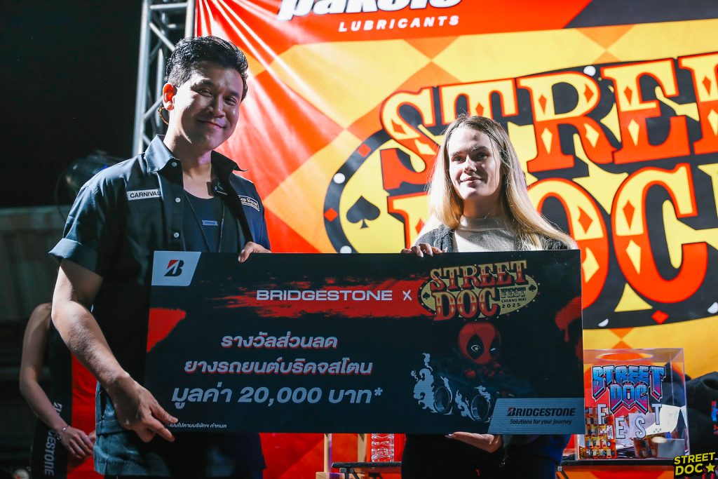 อาทิ ส่วนลดยางบริดจสโตนมูลค่า 40,000 บาท พร้อมของที่ระลึกอีกมากมายภายในงาน งาน “STREET DOC FEST Chiangmai 2025” เป็นการรวมตัวของกลุ่มคนรักรถซิ่ง รถแต่ง และคาร์คลับ มาร่วมพบปะสังสรรค์แลกเปลี่ยนความคิดเห็นและทีเด็ดโชว์รถสุดเท่ของตน จัดขึ้นเมื่อวันเสาร์ที่ 1 กุมภาพันธ์ 2568 ที่ศูนย์ประชุมและแสดงสินค้านานาชาติฯ จ.เชียงใหม่ โดย “STREET DOC” อินฟลูเอนเซอร์สายรถยนต์แถวหน้าของไทย โดยไฮไลท์ภายในงานยังมีเหล่าอินฟลูเอนเซอร์ชื่อดังสายรถยนต์รวมถึงยูทูบเบอร์แถวหน้าของไทยมาร่วมงาน เช่น คุณเบียร์ ปิยะเลิศ ใบหยก จากช่อง BeerBaiyoke ที่รวมตัวกับแก๊งมาร่วมอวดโฉมโชว์รถ Top Secret สร้างสีสันแก่ผู้เข้าร่วมงาน เป็นต้น