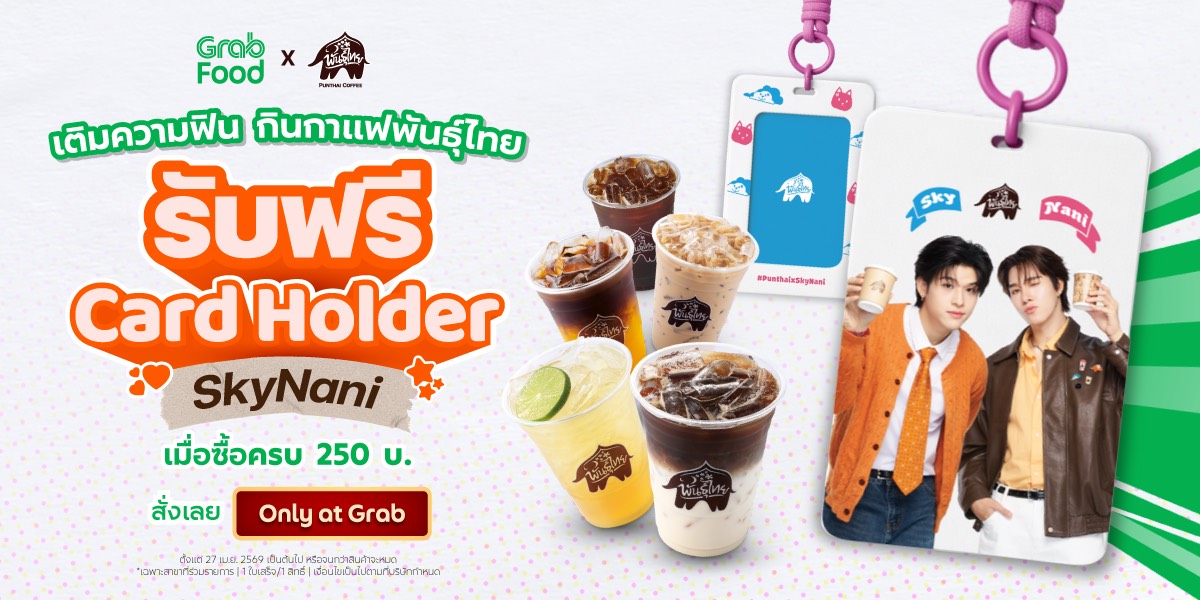 เริ่มต้นความฟินด้วยไอเทมสะสมสุดคิวท์ เพียงสั่งเครื่องดื่มพันธุ์ไทยเมนูที่ร่วมรายการครบ 250 บาท ผ่านแอปพลิเคชัน GrabFood รับฟรีทันที! Card Holder #PunthaixSkyNani ลายสกาย-นานิคู่กัน ที่ตอบโจทย์ทั้งการใช้งานและการสะสม ให้แฟนๆ ได้พกพาศิลปินคนโปรดไปด้วยทุกที่ทุกโมเมนต์ เริ่มสะสมได้ตั้งแต่วันที่ 27 เมษายน – 15 พฤษภาคม 2569 นี้ หรือจนกว่าของจะหมด