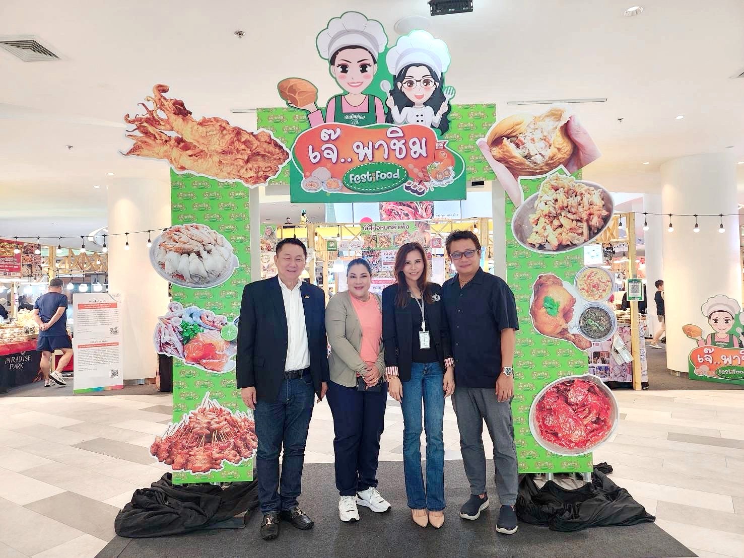 เอาใจสายกินต่อเนื่อง! พาราไดซ์ พาร์ค ศูนย์การค้าในเครือเอ็ม บี เค จัดตลาดมหกรรมอาหารขนาดใหญ่ รวมร้านดังจากทั่วฟ้าเมืองไทย ยกร้านเด็ด ร้านดัง ร้านอร่อยโดนใจ กว่า 50 ร้านค้า ให้คุณได้ช้อป ชิม อิ่มแบบจุก ๆ ที่งาน “เจ๊..พาชิม FESTiFOOD” โดยมี นายสมพล ตรีภพนารถ ประธานเจ้าหน้าที่บริหารธุรกิจศูนย์การค้า บริษัท เอ็ม บี เค จำกัด (มหาชน) (ที่ 1 จากซ้าย) ร่วมต้อนรับ “เจ๊แม็กซ์” กัลยาพร สาธรณ์ ผู้บริหารและประธานจัดงาน “เจ๊..พาชิม FESTiFOOD” (ที่ 2 จากซ้าย)และ ดร.พิริยะ โพธิ์วิจิตร (ที่ 4 จากซ้าย) ณ ชั้น 1 ลานรอยัล พาร์ค พลาซ่า ศูนย์การค้าพาราไดซ์ พาร์ค เมื่อเร็ว ๆ นี้