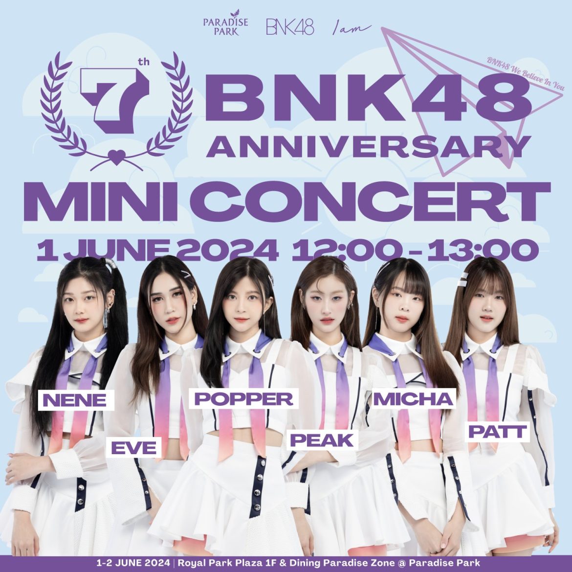 นอกจากนี้ในงานยังจัดเต็มด้วยความสนุกและความน่ารักสดใสกับมินิคอนเสิร์ต BNK48 รวมทั้ง Special Show ที่มากันแบบทั้งวงอีกด้วย  มาร่วมเก็บความประทับใจกับโมเมนต์พิเศษของคุณและศิลปินเกิร์ลกรุ๊ปคนโปรดของคุณกันได้ ที่งาน Fly to BNK48 7th Anniversary ในวันเสาร์ที่ 1 และวันอาทิตย์ที่ 2 มิถุนายน 2567 ตั้งแต่เวลา 12.00 น. – 21.00 น. ณ บริเวณชั้น 1 ลานรอยัลพาร์ค พลาซ่า และโซน Dining Paradise ศูนย์การค้าพาราไดซ์ พาร์ค
