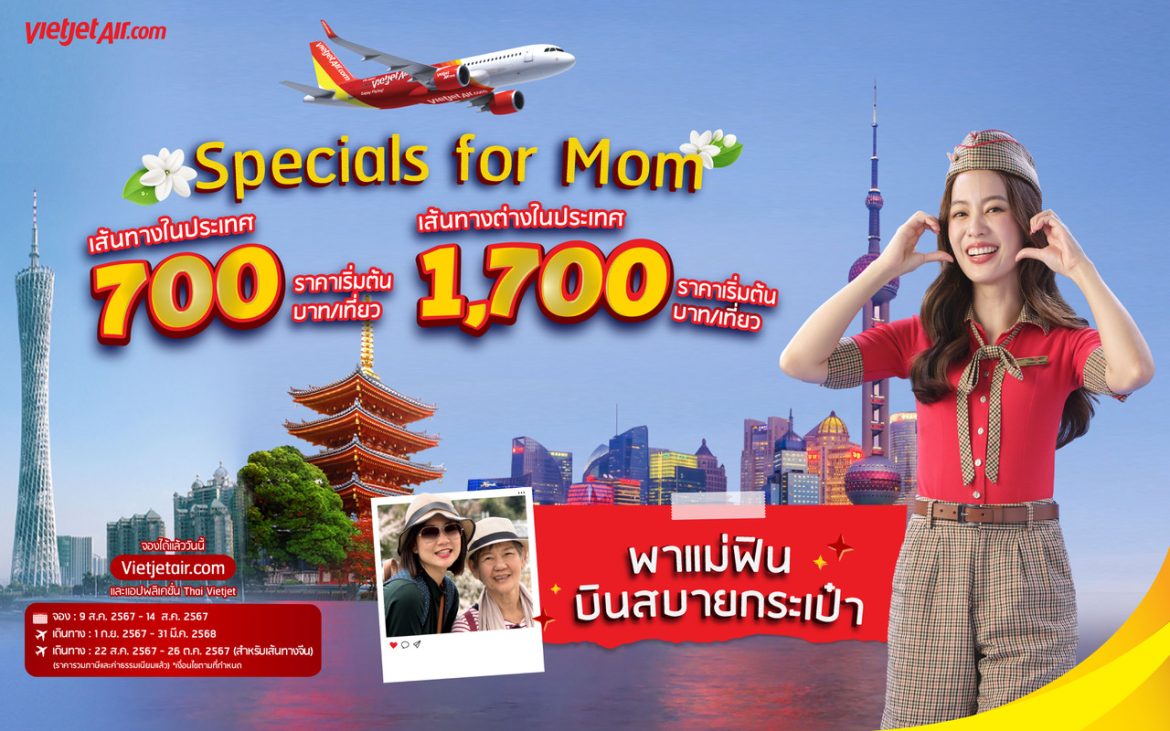 เวียตเจ็ทไทยแลนด์เชิญชวนผู้โดยสารบอกรักแม่ด้วยโปรโมชั่น “พาแม่ฟิน บินสบายกระเป๋า (Specials for Mom)” เสนอบัตรโดยสารราคาพิเศษ เริ่มต้นเพียง 700 บาท (ราคารวมภาษีและค่าธรรมเนียม) สำหรับเดินทางบนเครือข่ายเส้นทางบินภายในประเทศ และราคาเริ่มต้น 1,700 บาท (ราคารวมภาษีและค่าธรรมเนียม) สำหรับเส้นทางบินระหว่างประเทศของเวียตเจ็ทไทยแลนด์ สามารถสำรองบัตรโดยสารได้ตั้งแต่วันนี้จนถึงวันที่ 14 สิงหาคม 2567 ใช้เดินทางได้ระหว่างวันที่ 1 กันยายน 2567 –31 มีนาคม 2568 (ยกเว้นวันหยุดนักขัตฤกษ์) ที่ th.vietjetair.com