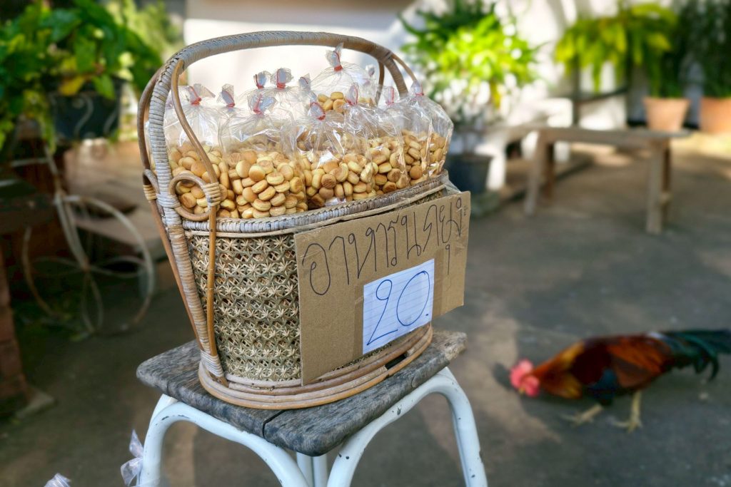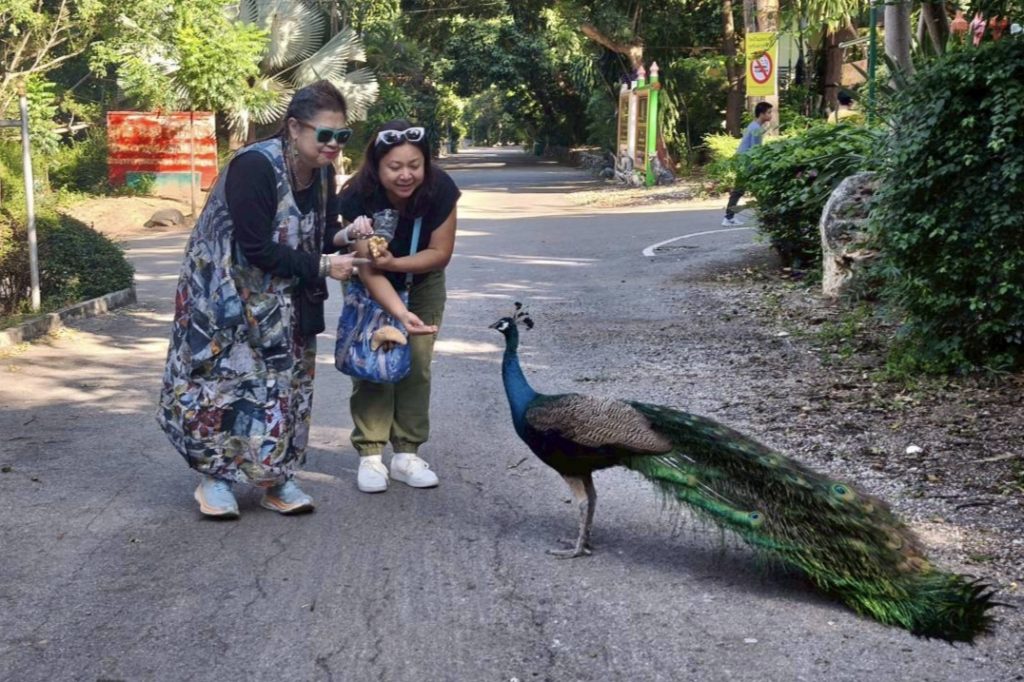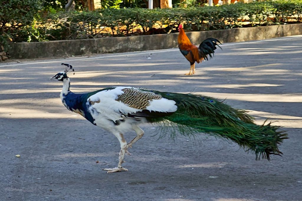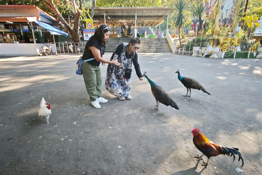 เสียงแม่ค้าที่ขายของทักทายด้วยน้ำเสียงอันเป็นมิตร “ซื้ออาหารให้นกยูงมั้ยคะ” คือที่วัดพระขาว จะมีนกยูงอยู่เป็นจำนวนมาก เข้ามาอาศัยกินนอนอยู่ในบริเวณวัด เดินเล่นเหมือนไก่บ้าน แถมยังเชื่องเสียด้วยสิ อาหารถุงละ 20 บาทเท่านั้นเอง ซื้อเสร็จโปรยลงพื้นให้นกยูงมากิน ก็ดูเพลิดเพลินดี ใครต้องการถ่ายรูปกับนกก็ยกสมาร์ทโฟนขึ้นมาบันทึกภาพได้เลย เสียดายที่วันนี้นกยูงไม่ได้กางปีกลำแพน เลยอดที่จะได้ภาพสวยๆ กัน
