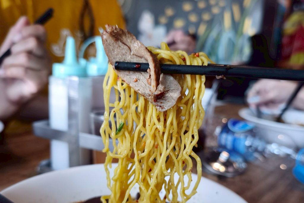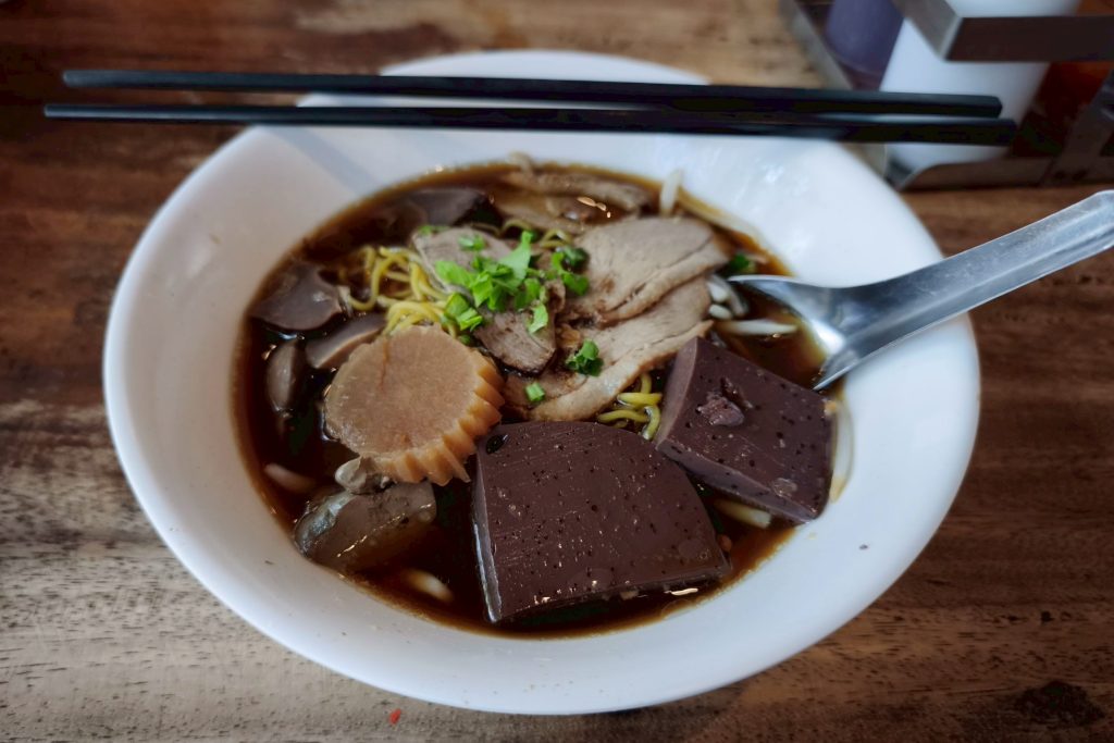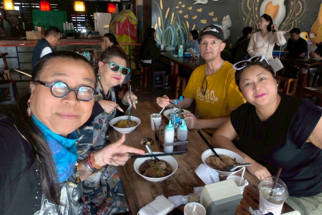 เวลาใกล้เที่ยงหลังจากเดินทาออกจากตลาดนัด พวกเราก็พากันแวะรับประทานอาหารมื้อเที่ยงกัน โดยมื้อนี้ก็จัดเป็นก๋วยเตี๋ยวเรือร้านดัง ที่ร้าย “เตี๋ยวเป็ดกลางดง” ร้านนี้ลูกค้าเยอะเลย จอดรถเสร็จก็พากันเดินเข้าไปนั่งและสั่งเมนูกัน ก็เลือกเอาเมนูหลัก หรือเมนูซิกเนเจอร์ของร้านนั่นเอง หน้าตาดูดี แถมรสชาติยังโอเคอีกด้วย จัดกันคนละชามก็อิ่มกันไป อิ่มกันได้ที่ก็พากันออกเดินทางกันต่อ โดยมีเป้าหมายอยู่ที่ วัดพระขาว ระยะทางจากร้านก๋วยเตี๋ยวเป็ดไปยังวัดพระขาว อยู่ที่ประมาณ 9.8 กิโลเมตร ใช้เวลาเดินทางเพียงแค่ 10 นาทีเท่านั้นเอง
