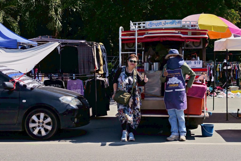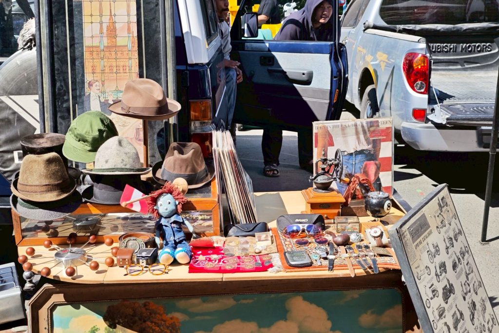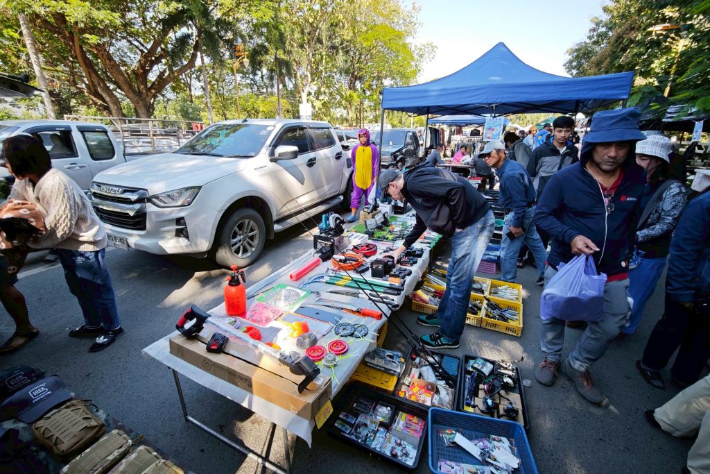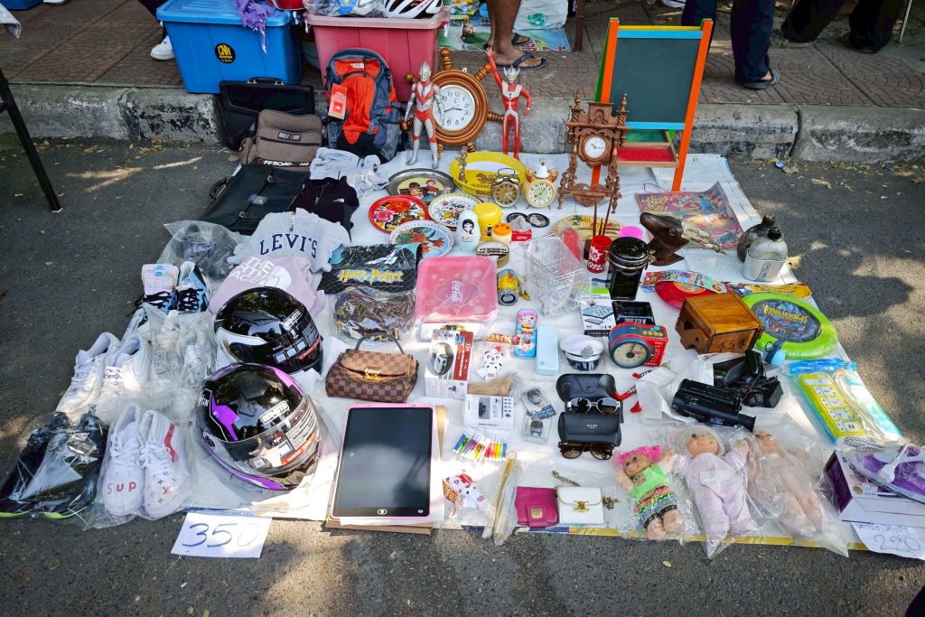 พวกเราก็เริ่มเดินกันตั้งแต่หัวมุมของตลาด ซึ่งตลาดก็จะอยู่ทางด้านขวา ก็ใช้พื้นที่ประมาณ 2 เลนของถนน ยังคงเหลืออีกสองเลนให้รถได้สัญจรไปมา ร้านแรกๆ ก็ไม่ค่อยมีของที่เราชอบมากนัก ส่วนมากก็จะเป็นจำพวกเสื้อผ้าและอุปกรณ์ทำการเกษตร เดินดูของไปได้สักระยะก็จะเริ่มมีของที่หลากหลายมากขึ้น ก็จำพวกของเก่าวินเทจมือสอง ก็มี แว่นตา กล้องถ่ายวิดีโอ ไอแพด หมวกกันน็อค และของอื่นๆ อีกหลายอย่าง ก็ประมาณว่าปนๆ กันไป