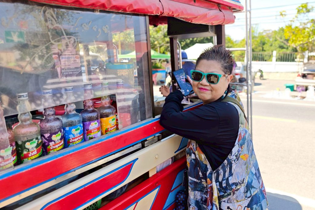 มองไปไกลๆ เกือบๆ ท้ายตลาด เราจะมองเห็นรถสองแถวคันสีแดง เป็นรถขายกาแฟโบราณและเครื่องดื่มหลากหลาย กระหายน้ำเราก็เลยแวะจัดโอ้เลี้ยงและน้ำมะนาว คนขายเป็นคนจังหวัดระนอง รถที่ใช้เป็นรถสองแถวที่เรียกว่า “รถโพถ้อง” เป็นรถที่มีเอกลักษณ์เฉพาะตัว และก็จะพบเห็นได้ที่จังหวัดทางภาคใต้เท่านั้น ดื่มโอเลี้ยงและน้ำมะนาวพอดับกระหายกันแล้วก็ได้เวลาเดินทางกันต่อ โดยมีจุดหมายอยู่ที่ วัดพระขาว ปากช่อง