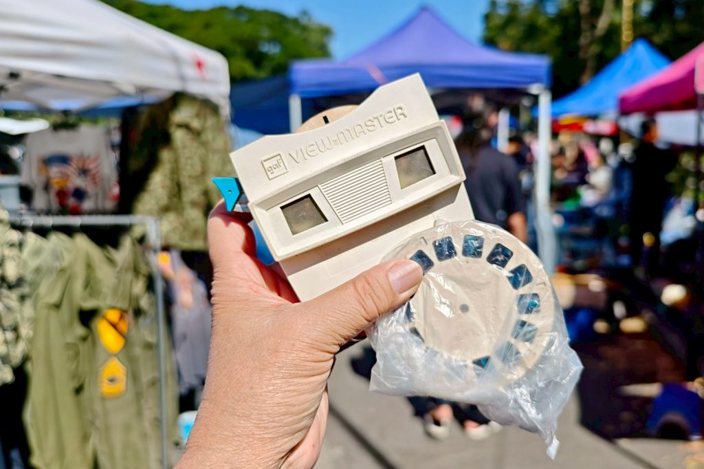 เดินช็อปฯ เพลินๆ กันไปประมาณช่วงกลางตลาด เราสองคนก็เจอของที่ถูกใจ มันคือ อุปกรณ์สำหรับส่องดูภาพ หรือ View Master เวลาจะดูก็ใส่แผ่นที่มีรูปภาพแบบสไลด์ เป็ยแผ่นกลมๆ มี 14 ช่อง เสียบเข้าไปแล้วก็ใช้นิ้วกดก้านทางด้านขวา แล้วเลื่อนกดดูไปเรื่อยๆ เพลิดเพลินดี ชิ้นนี้ก็ต่อรองราคากับพ่อค้า ก็ได้ราคาเป็นที่พอใจก็เลยซื้อมา