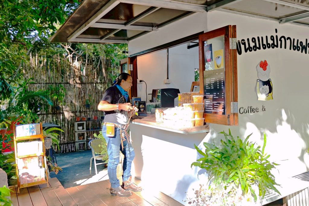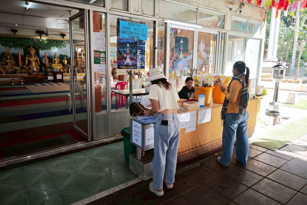 เดินออกจากลานจอดก็เลี้ยวขวาขึ้นเนินเล็กน้อย เราจะมองเห็นพระขาวตั้งเด่นเป็นสง่าอยู่บนยอดเขา เดินไปสักพักก็จะเจอกับวัดที่มีบันไดขึ้นลงทั้งสองด้าน ตรงมุมบริเวณด้านซ้ายจะมีร้านกาแฟตั้งอยู่ เอาไว้คอยบริการสำหรับลูกค้าที่ต้องการซื้อมานั่งจิบและโปรยอาหารให้นกยูง บริเวณหน้าร้านจะมีอาหารของนกยูงตั้งจำหน่ายอยู่บนเก้าอี้ จำหน่ายถุงละ 20 บาท เราก็เลือกซื้อทั้งกาแฟและอาหารนกซะพร้อมกันเลย