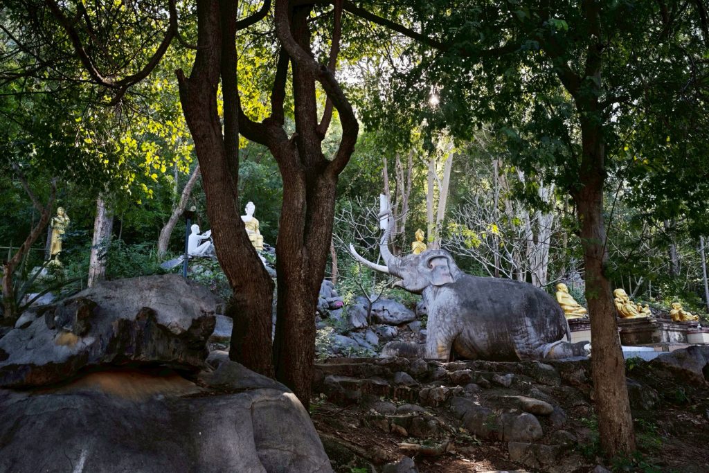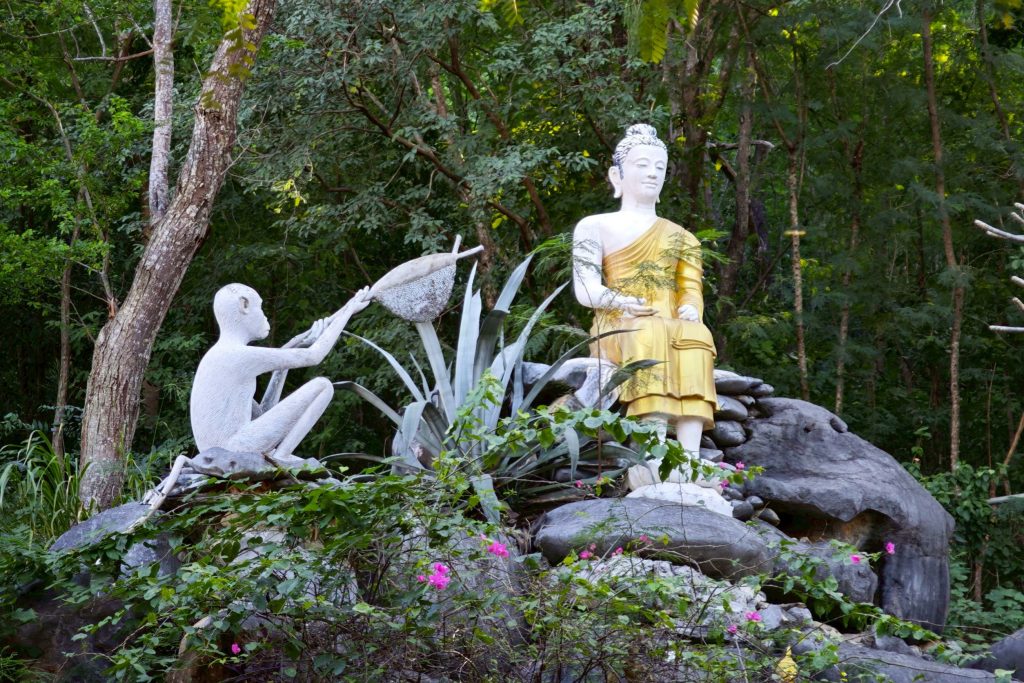 มองดูรอบๆ บริเวณวัด เราจะพบกับรูปปั้นของลิงกำลังถวายรังผึ้งให้ปแก่พระพุทธเจ้า มีรูปปั้นช้างตัวใหญ่งาขาวๆ ทำท่าหมอบไหว้พระพุธเจ้าเช่นเดียวกัน ใกล้ๆ กันก็ะมีกุฏิของพระสงฆ์ตั้งเรียงรายอยู่ห่างๆ เดินย้อนกลับลงมาจะมีระฆังห้อยเรียงรายอยู่สองข้างทางเดิน มีเอาไว้ให้ผู้คนได้ตีเพื่อส่งเสียงให้ดังกังวาลไปทั่วบริเวณ เป็นสัญลักษณ์ว่าได้ทำบุญแล้ว