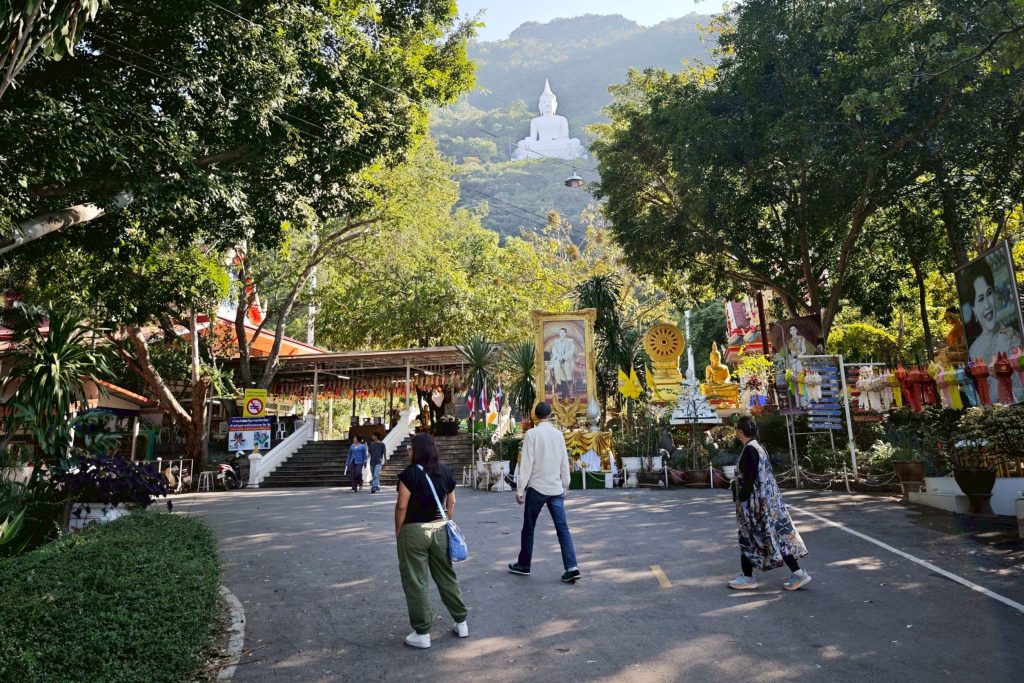 ในขณะที่ยืนอยู่ด้นล่าง เราก็จะมองเห็นนักท่องเที่ยวกำลังเดินขึ้นบันไดไปยังบริเวณด้านบน บางส่วนก็กำลังพากันเดินลงมายังบริเวณด้านล่าง แสงแดดอ่อนๆ ในยามเย็น ทอดลำแสงเป็นเส้นแนวยาวสวยงาม สีเขียวชอุ่มของแมกไม้บนภูเขาที่ตัดกับองค์พระขาว ทำให้องค์พระนั้นโดดเด่นเป็นสง่าและมองเห็นได้อย่างชัดเจน