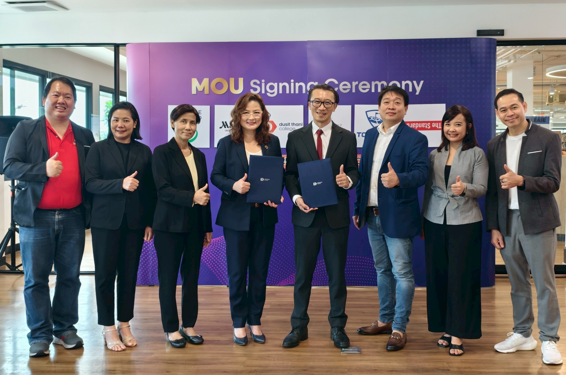 คุณสุขวสา ภูชัชวนิชกุล (ที่ 4 จากซ้าย) ผู้ช่วยกรรมการผู้จัดการใหญ่ บริษัท พีทีจี เอ็นเนอยี จำกัด (มหาชน) ร่วมลงนามความร่วมมือกับ ดร. อรรถเวทย์ พฤกษ์สถาพร (ที่ 5 จากซ้าย) อธิการบดี วิทยาลัยดุสิตธานี เพื่อเปิดโอกาสให้นักศึกษาได้พัฒนาศักยภาพด้านการทำงานในอุตสาหกรรมการท่องเที่ยว รวมถึงการบริการอาหาร และเครื่องดื่ม ผ่านการฝึกปฏิบัติงานจริง เพื่อเตรียมความพร้อมก่อนก้าวเข้าสู่การทำงานอย่างมืออาชีพ อีกทั้งยังเป็นการวางรากฐานให้นักศึกษาได้มีโอกาสร่วมงานกับพีทีจี และบริษัทในเครือทั้ง กาแฟพันธุ์ไทย, คอฟฟี่ เวิลด์, ซับเวย์ รวมถึงแบรนด์อาหารและเครื่องดื่มอื่นๆ พร้อมทั้งสนับสนุนและต้อนรับบุคลากรรุ่นใหม่ที่มีคุณภาพเข้าสู่ทีมอย่างต่อเนื่อง จัดขึ้น ณ Co–Working Space วิทยาลัยดุสิตธานี