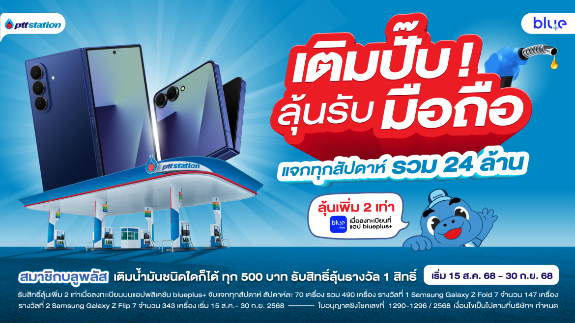 พีทีที สเตชั่น เติมสนุก แจกสนั่น กับแคมเปญใหญ่ “เติมปั๊บ ลุ้นรับมือถือ” แจกฟรี! Samsung Galaxy Z Fold7 & Z Flip7” สมาร์ตโฟนสุดล้ำรุ่นใหม่ล่าสุด รวม 490 รางวัล มูลค่ารวมกว่า 24 ล้านบาท เพียงเป็นสมาชิก blueplus+ และเติมน้ำมันชนิดใดก็ได้ ครบทุก 500 บาท รับ 1 สิทธิ์ลุ้นโชคฟรี แจกหนักทุกสัปดาห์ เพียงแจ้งเบอร์โทรศัพท์ที่ลงทะเบียนสมาชิก blueplus+ ไว้ และพิเศษ! สำหรับสมาชิกบลูพลัสรับสิทธิ์ลุ้นรางวัล X2 เพียงกดรับสิทธิ์ผ่านกิจกรรมบนแอปพลิเคชัน blueplus+ ครั้งแรก ครั้งเดียวตลอดกิจกรรม ตลอดช่วงแคมเปญหลังลงทะเบียน ตั้งแต่วันที่ 15 สิงหาคม 2568 ถึง 30 กันยายน 2568 ที่ พีทีที สเตชั่น ทุกสาขาทั่วประเทศที่ร่วมรายการ
