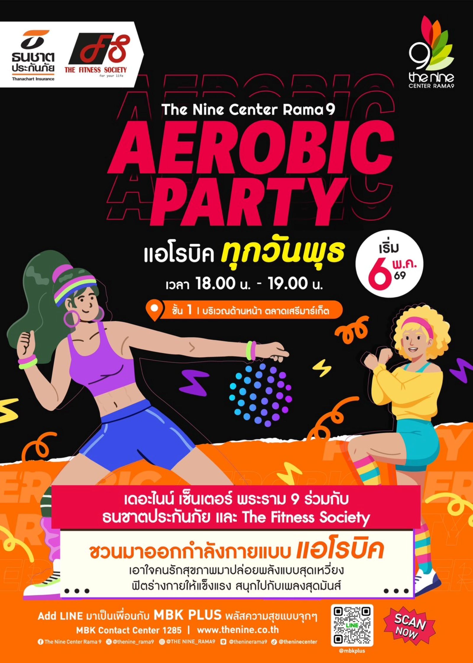 เดอะไนน์ เซ็นเตอร์ พระราม 9 ศูนย์การค้าในเครือเอ็ม บี เค ร่วมกับธนชาติประกันภัย และThe Fitness Society เอาใจคนรักสุขภาพ ชวนชาวออฟฟิศ และชาวย่านพระราม 9 มาสลัดความเครียดหลังเลิกงาน พร้อมปลุกพลังสร้างความตื่นตัวกลางสัปดาห์ไปกับกิจกรรม AEROBIC PARTY แอโรบิคปาร์ตี้ เปลี่ยนเย็นวันพุธธรรมดาให้กลายเป็นช่วงเวลาแห่งความสนุก สุขภาพดี และเต็มไปด้วยสีสัน