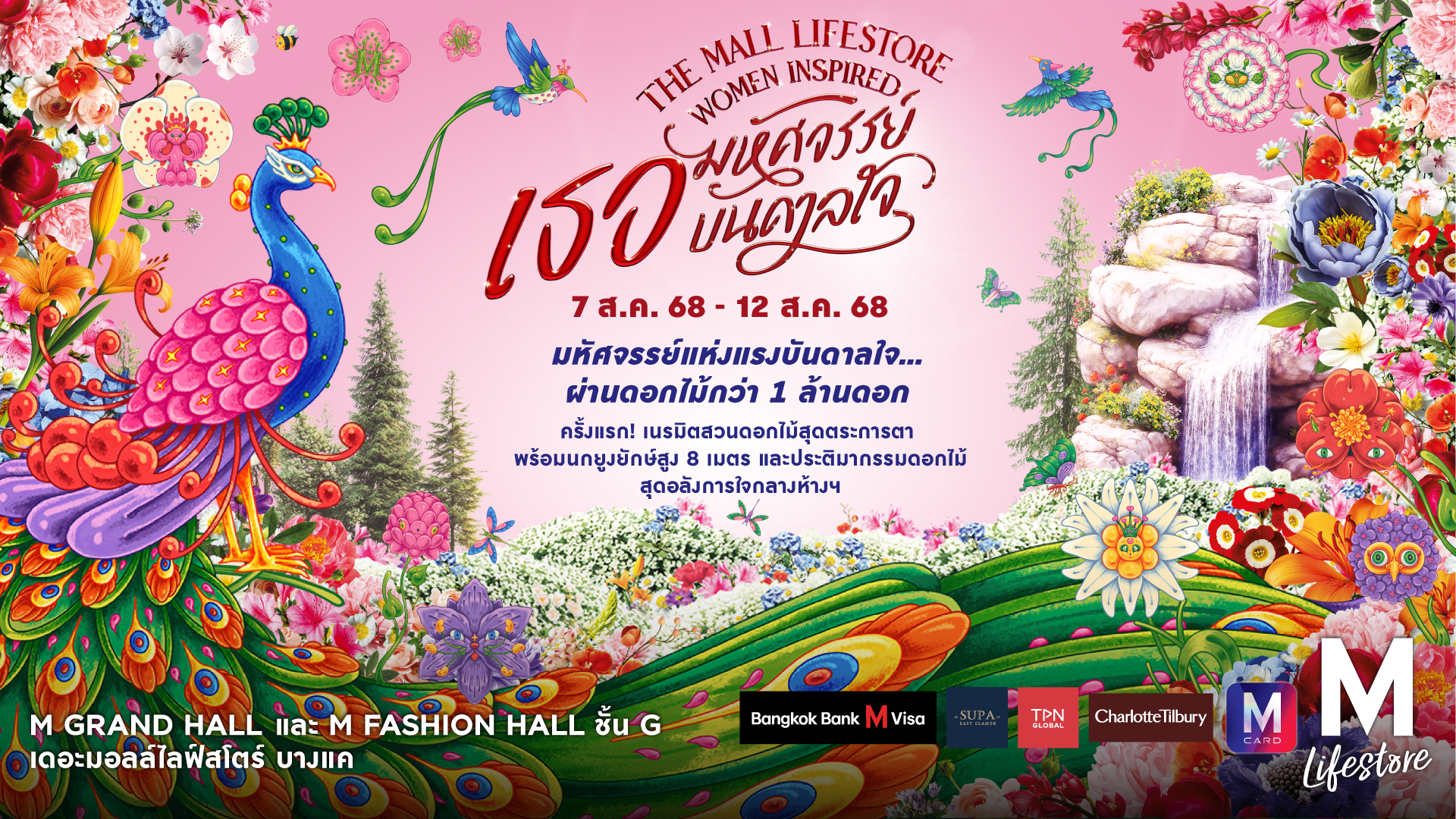เดอะมอลล์ไลฟ์สโตร์ บางแค ชวนสัมผัสมนต์เสน่ห์ของดอกไม้ ในงาน “The Mall Lifestore Women Inspired เธอ…มหัศจรรย์ บันดาลใจ” พบความมหัศจรรย์แห่งแรงบันดาลใจ..ผ่านดอกไม้กว่า 1 ล้านดอก พร้อมประติมากรรมนกยูงดอกไม้สุดอลังการ ตั้งแต่วันที่ 7-12 สิงหาคม 2568 ที่ M Grand Hall และ M Fashion Hall ชั้น G เดอะมอลล์ไลฟ์สโตร์ บางแค