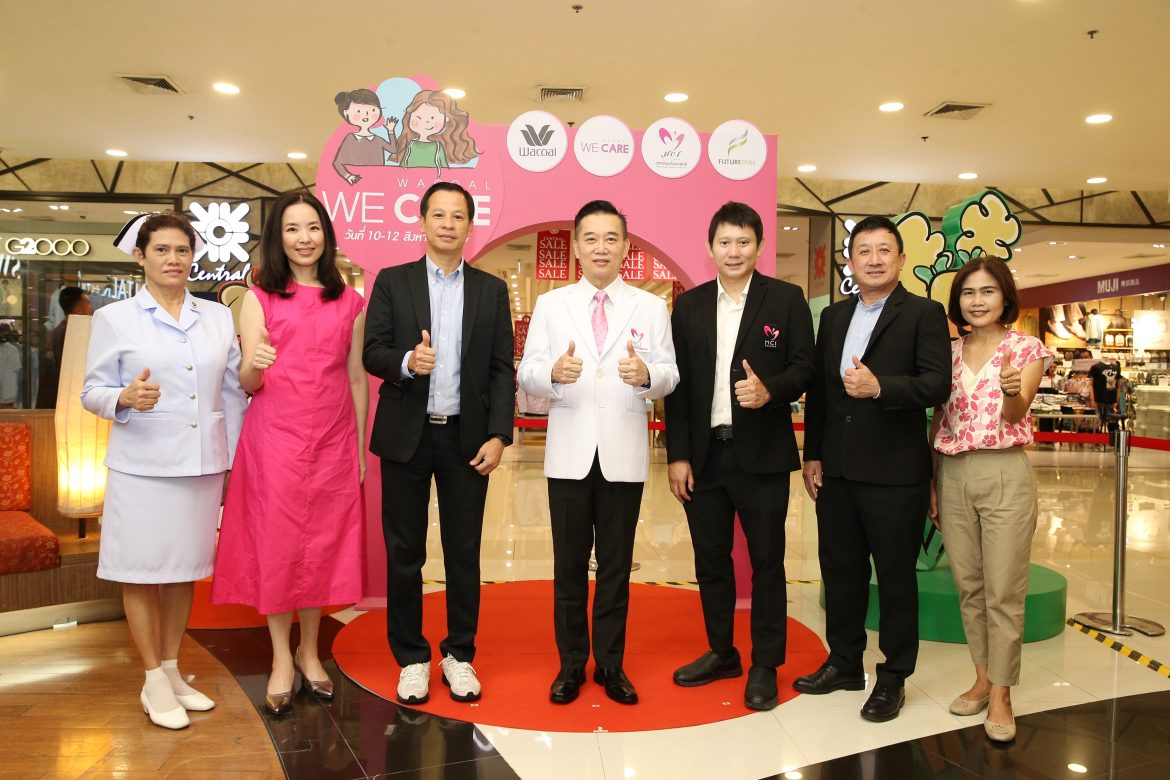 เรืออากาศเอกนายแพทย์สมชาย ธนะสิทธิชัย (กลาง) ผู้อำนวยการสถาบันมะเร็งแห่งชาติ นายแพทย์ดนัย มโนรมณ์ (ที่ 3 จากขวา) รองผู้อำนวยการด้านพัฒนาระบบสุขภาพ สถาบันมะเร็งแห่งชาติ นายประณต เวสารัชวิทย์ (ที่ 3 จากซ้าย) กรรมการบริหารและผู้อำนวยการฝ่ายบริหารการขายวาโก้ นางสาวจันทรัตน์ สังข์รังสรรค์ (ที่ 2 จากซ้าย) รองผู้อำนวยการฝ่ายการตลาด บริษัท ไทยวาโก้ จำกัด (มหาชน) นางสาวบุปผาชาติ ขุนอินทร์ (ซ้ายสุด) รองผู้อำนวยการด้านการพยาบาล สถาบันมะเร็งแห่งชาติ นายมนตรี ฐิติวิวรรธน์กุล (ที่ 2 จากขวา) ผู้อำนวยการด้านการขาย และนางสาวภัทรา โมรา (ขวาสุด) ผู้จัดการฝ่ายบริหารลูกค้าสัมพันธ์ ศูนย์การค้าฟิวเจอร์พาร์ค และสเปลล์ ร่วมเปิดกิจกรรม “Wacoal We Care วาโก้ห่วงใย ชวนตรวจมะเร็งปากมดลูกฟรี ในวันแม่” ด้วยวิธี HPV DNA test (การเก็บสิ่งส่งตรวจทางช่องคลอดด้วยตนเอง) 1 ใน 5 ของโรคมะเร็งพบบ่อยในผู้หญิงไทย รู้ก่อน รักษาไว ห่างไกลมะเร็งปากมดลูก เพื่อมอบของขวัญเดือนแห่งวันแม่ ให้คุณแม่-คุณลูกตรวจมะเร็งปากมดลูกฟรี ลดภาระค่าใช่จ่าย พร้อมกระตุ้นกิจกรรมด้วยการมอบกางเกงในวาโก้ฟรี 1 ชิ้นต่อ 1 คน ที่เข้ารับการตรวจและส่งชุดเก็บสิ่งส่งตรวจในวันกิจกรรม ณ บริเวณชั้น 1 โซนเซ็นทรัล (ฝั่งอีสต์) ศูนย์การค้าฟิวเจอร์พาร์ค เมื่อเร็วๆ นี้