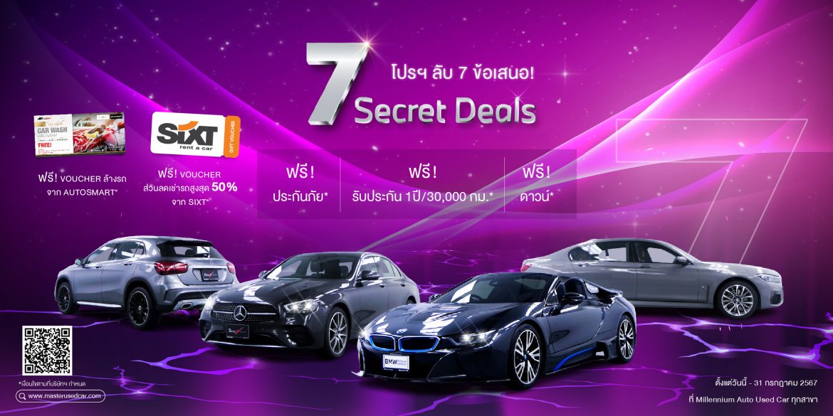มาสเตอร์ เซอร์ทิฟายด์ ยูสคาร์ มอบแคมเปญฉลองเดือนกรกฎาคม จัดโปรฯ ลับ! ‘7 Secret Deals’ ยกทัพยนตรกรรมยุโรปมือสอง สภาพดี ราคาคุ้มค่า มีให้เลือกกว่า 20 คัน คัดสรรมาให้ลูกค้าได้เลือกกว่า 20 คัน ตั้งแต่วันนี้ ถึง 31 กรกฎาคม 2567 ที่โชว์รูม มิลเลนเนียม ออโต้ ยูสคาร์ ทุกสาขา