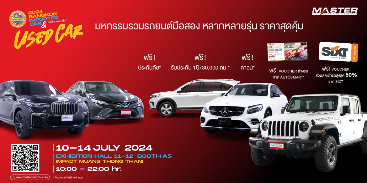 มาสเตอร์ เซอร์ทิฟายด์ ยูสคาร์ เดินเครื่องเต็มพิกัด จัดเต็มสูบที่งาน Bangkok Imported Car & Used Car Show 2024 คัดสรรรถยนต์มือสองหลากรุ่น หลายแบรนด์ มาจัดแสดงให้สัมผัสกันแบบจุใจ ระหว่างวันที่ 10-14 กรกฎาคม 2567 ที่บูธ A5 ฮอลล์ 11-12 อิมแพ็คเอ็กซิบิชั่น เซ็นเตอร์ ศูนย์การแสดงสินค้าและการประชุม อิมแพ็ค เมืองทองธานี