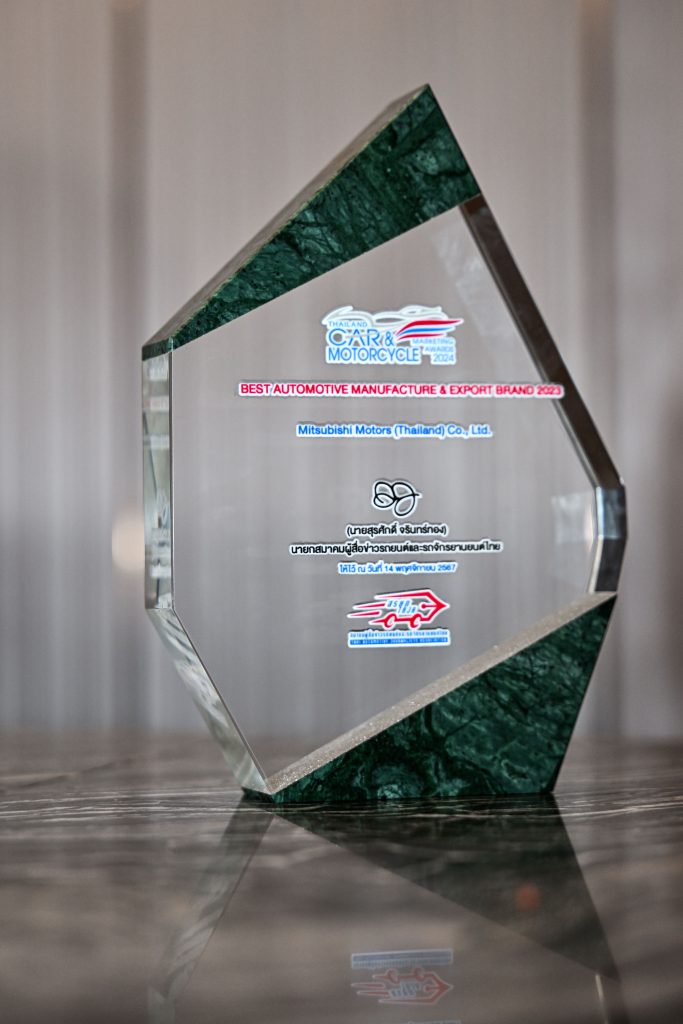นางสาวริสึโคะ คาเนะโคะ (ซ้าย) ผู้ช่วยกรรมการผู้จัดการใหญ่อาวุโส สายงานบริหารประสบการณ์ลูกค้าและนวัตกรรมการบริการ บริษัท มิตซูบิชิ มอเตอร์ส (ประเทศไทย) จำกัด รับมอบรางวัลเกียรติยศ “ผู้ผลิตและส่งออกรถยนต์สูงสุด” จาก นายสุรศักดิ์ จรินทร์ทอง นายกสมาคมผู้สื่อข่าวรถยนต์และรถจักรยานยนต์ไทย (สรยท.) ในพิธีประกาศรางวัลรถยนต์และรถจักรยานยนต์ยอดเยี่ยมประจำปี 2567 ซึ่งจัดโดยสมาคมผู้สื่อข่าวรถยนต์และรถจักรยานยนต์ไทย (สรยท.) ณ เดอะฮอลล์ แบงค็อก (The HALLS Bangkok) เมื่อเร็วๆ นี้