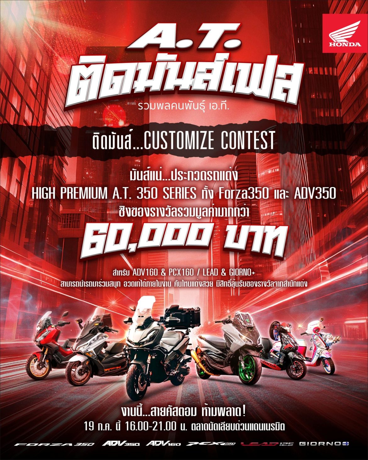 รถจักรยานยนต์ฮอนด้า ชวนสายคัสตอมมาปล่อยของในกิจกรรม “ติดมันส์ CUSTOMIZE CONTEST” เปิดเวทีให้เจ้าของรถจักรยานยนต์ฮอนด้าเอ.ที. ในคลาส 350 ซีซี ทั้ง 2 รุ่น ได้แก่ FORZA350 และ ADV350 ได้มาประชันรถแต่งสุดเฟี้ยว ประกวดชิงรางวัล Popular Vote รวมมูลค่ากว่า 60,000 บาท ภายในงาน “A.T. ติดมันส์เฟส” ที่จะจัดขึ้นในวันเสาร์ที่ 19 กรกฎาคม 2568 ณ ตลาดนัดเลียบด่วนแดนเนรมิต ตั้งแต่เวลา 16.00 – 21.00 น.