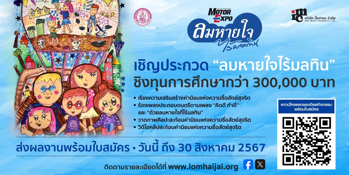 มูลนิธิลมหายใจไร้มลทิน ร่วมกับ กรมกิจการเด็กและเยาวชน ชวนเด็ก และเยาวชน ส่งผลงานประกวด 4 ประเภท ได้แก่ เรียงความ ร้องเพลง วาดภาพ และ VDO Clip เพื่อร่วมรณรงค์สร้างค่านิยมซื่อสัตย์สุจริต ตั้งแต่วันนี้ถึง 30 สิงหาคม 2567