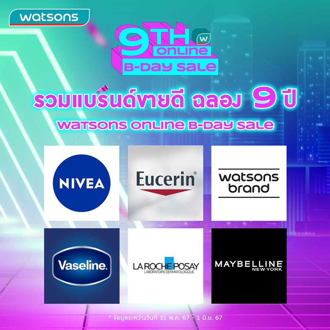 เมื่อวันที่ 31 พฤษภาคม – 1 มิถุนายน 2567 ที่ผ่านมา วัตสัน ประเทศไทย  จัดแคมเปญฉลองวันเกิด วัตสัน ออนไลน์ ครบรอบ 9 ปี หั่นราคาสินค้าสูงสุดถึง 70% พร้อมลดเพิ่ม 15% เที่ยงคืนถึงเที่ยงวัน ครอบคลุมหลากหลายหมวดหมู่ในช่องทางออนไลน์ ทั้งบนแอปพลิเคชั่น และในหน้าเว็บไซต์ เดินหน้ามอบประสบการณ์ชอปสนุกพร้อมราคาคุ้มค่าให้กับผู้บริโภค