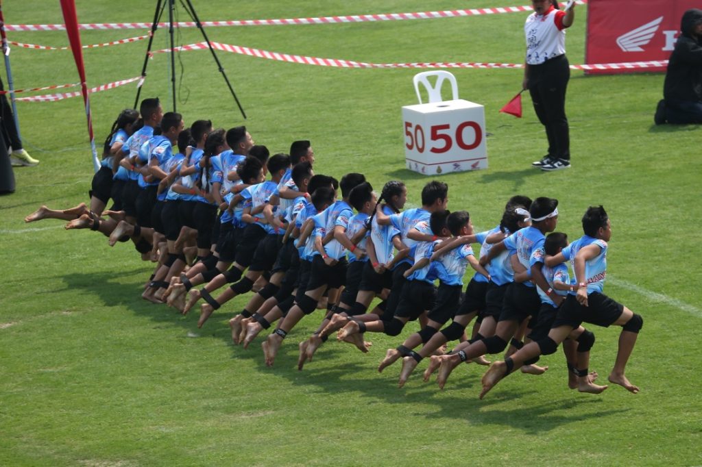 โดยกติกาการแข่งขันเบื้องต้น ดังนี้ แต่ละทีมต้องประกอบด้วยนักกีฬาตัวจริง 30 คน โดยมีหัวหน้าทีม 1 คน พร้อมนักกีฬาสำรอง 4 คน และครูผู้ฝึกซ้อม 1-3 คน นักกีฬาทั้ง 30 คนต้องผูกขาติดกันและร่วมกันวิ่งเข้าเส้นชัยในระยะทาง 50 เมตร โดยอาศัยพลังของความสามัคคี การสื่อสาร การทำงานเป็นทีม ที่มีผลมาจากการฝึกฝนที่เข้มข้นอย่างต่อเนื่อง