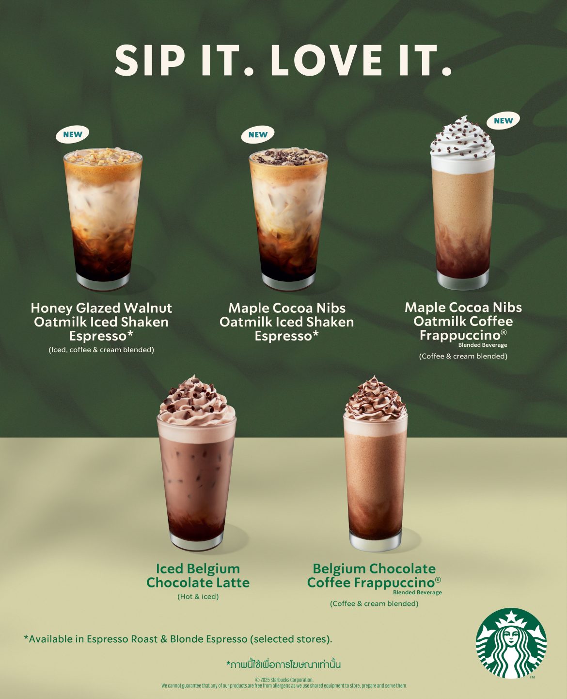 • กลับมาอีกครั้งกับเครื่องดื่มยอดนิยมอย่าง เบลเยียม ช็อกโกแลต คอฟฟี่ แฟรบปูชิโน่ (Belgium Chocolate Coffee Frappuccino® Blended Beverage) พร้อมเอาใจผู้ที่ชื่นชอบรสชาติเข้มข้นของช็อกโกแลตเบลเยี่ยมสุด    พรีเมียม มีให้เลือกทั้งรูปแบบร้อน เย็น ปั่น (ทั้งสูตรครีมและกาแฟ) สามารถซื้อเครื่องดื่มได้ตั้งแต่วันที่ 22 กันยายน ถึง 3 พฤศจิกายน 2568 ที่ร้านสตาร์บัคส์ทุกสาขาทั่วประเทศ