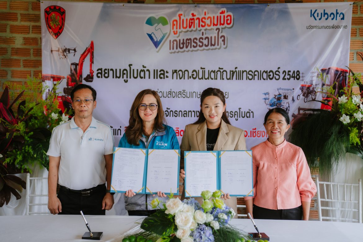 นางวราภรณ์ โอสถาพันธุ์ กรรมการรองผู้จัดการใหญ่อาวุโส บริษัทสยามคูโบต้าคอร์ปอเรชั่น จำกัด กล่าวว่า สยามคูโบต้ายึดมั่นในพันธกิจที่จะอยู่เคียงข้างและเติบโตไปพร้อมกับเกษตรกรไทย โดยโครงการ ‘คูโบต้าร่วมมือ เกษตรร่วมใจ’ จัดตั้งขึ้นเพื่อเปิดโอกาสให้กลุ่มเกษตรกรและวิสาหกิจชุมชนได้เข้าถึงเทคโนโลยีที่จะช่วยทุ่นแรง และเพิ่มความแม่นยำในการผลิต สยามคูโบต้าเล็งเห็นถึงความสำคัญของการนำเทคโนโลยีและเครื่องจักรกลการเกษตรมาใช้ในการทำเกษตรแบบรวมกลุ่ม ซึ่งจะช่วยให้เกษตรกรสามารถเข้าถึงเครื่องมือที่ทันสมัยได้อย่างทั่วถึง นำไปสู่การบริหารจัดการแปลงเพาะปลูกที่มีประสิทธิภาพ โดยในครั้งนี้ได้ส่งมอบเครื่องจักรกลการเกษตรคูโบต้า ประกอบด้วย รถเกี่ยวนวดข้าวคูโบต้า รุ่น DC-70 Plus+KIS จำนวน 1 คัน พร้อมชุดเก็บเกี่ยวถั่วเหลือง BK70 และโดรนการเกษตร รุ่น KD-1 จำนวน 1 ลำ ให้แก่ กลุ่มผู้ผลิตเมล็ดพันธุ์ข้าวบ้านหนองบัวหลวง อ.แม่แตง จ.เชียงใหม่ เพื่อเพิ่มคุณภาพและปริมาณผลผลิต ลดต้นทุนแรงงานและเวลา พร้อมพัฒนาสู่ศูนย์กลางการผลิตเมล็ดพันธุ์ถั่วเหลืองคุณภาพ อีกทั้งเป็นต้นแบบการบริหารจัดการเครื่องจักรแบบรวมกลุ่มอย่างมีประสิทธิภาพ นอกจากนี้ยังมอบ แทรกเตอร์คูโบต้า รุ่น L5018SP KIS จำนวน 1 คัน พร้อมอุปกรณ์ต่อพ่วง รวม 6 รายการ และรถปลูกผัก KP-202 จำนวน 1 คัน ให้แก่ วิสาหกิจชุมชนผลิตดอกไม้ อ.แม่ริม จ.เชียงใหม่ เพื่อยกระดับคุณภาพและมูลค่าการผลิตดอกไม้ สร้างรายได้ เสริมความเข้มแข็ง และขยายผลสู่ชุมชนอื่นได้ต่อไป