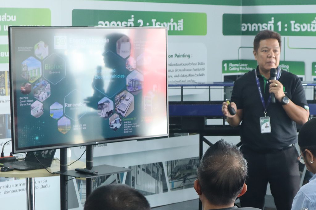 “สำหรับการเยี่ยมชมโรงงานในครั้งนี้ถือเป็นครั้งแรกที่ทาง เน็กซ์ พอยท์ ได้เปิดโอกาสให้สื่อมวลชนได้เดินทางมาสัมผัสความยิ่งใหญ่ของโรงงานทั้ง 2 แห่ง คือ โรงงานผลิตรถยนต์เพื่อการพาณิชย์ที่ดำเนินการโดยบริษัท แอ๊บโซลูท แอสเซมบลี จํากัด ซึ่งเป็นบริษัทร่วมทุนระหว่างบริษัท พลังงานบริสุทธิ์ จำกัด (มหาชน) (EA) และบริษัท เน็กซ์ พอยต์ จำกัด (มหาชน) ถือเป็นโรงงานผลิตยานยนต์ไฟฟ้าเชิงพาณิชย์แบบครบวงจรแห่งแรกของคนไทย และโรงงานผลิตแบตเตอรี่ลิเธียมไอออนอมิตา (Amita) ดำเนินการโดยบริษัท อมิตา เทคโนโลยี (ประเทศไทย) จำกัด ซึ่งเป็นส่วนหนึ่งของกลุ่มบริษัท พลังงานบริสุทธิ์ จำกัด (มหาชน) (EA)” นายสุรศักดิ์ กล่าว