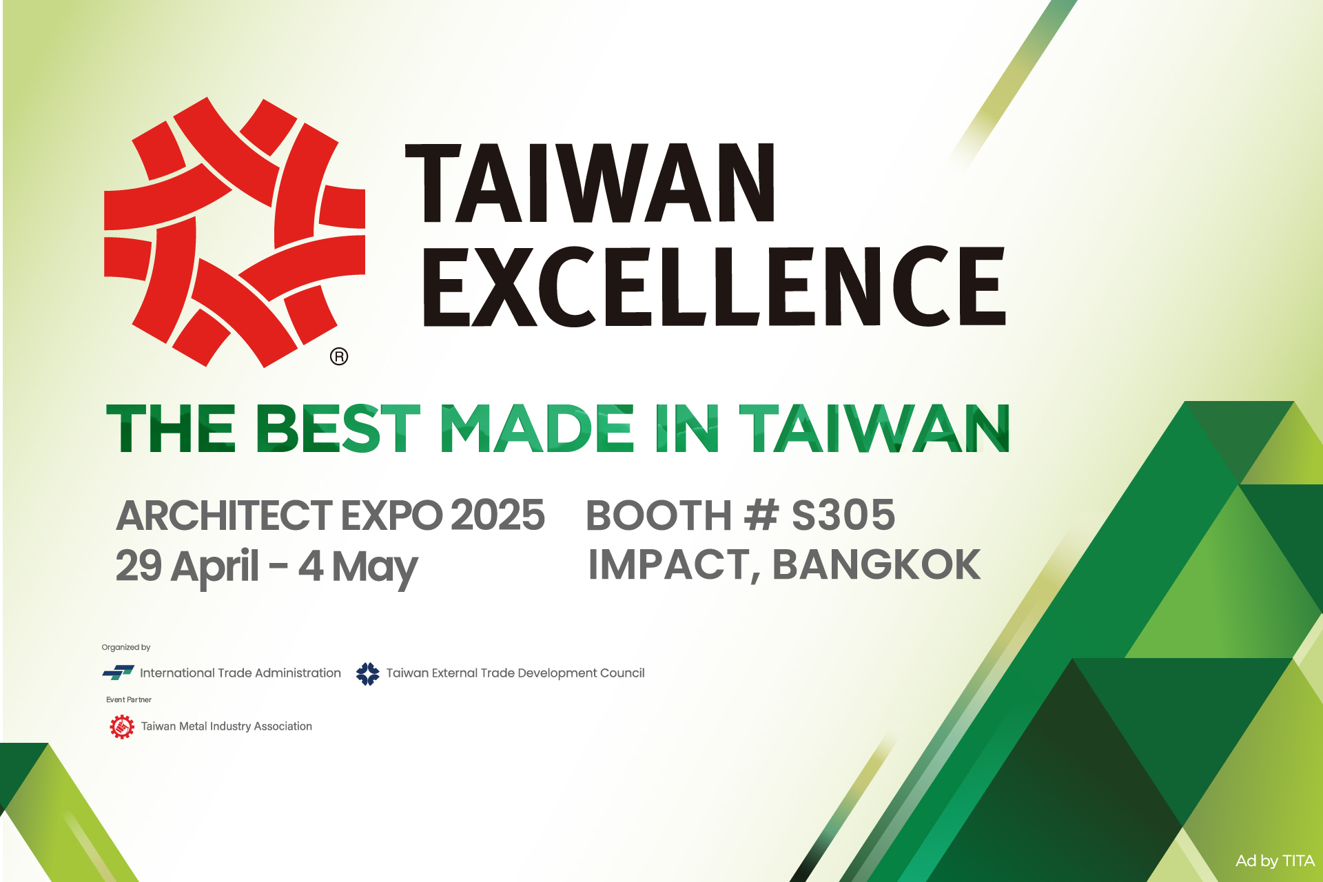 Taiwan Excellence เตรียมพลิกโฉมอนาคตของเทคโนโลยีการก่อสร้างที่ยั่งยืนในงาน ARCHITECT EXPO 2025 งานแสดงเทคโนโลยีการก่อสร้างชั้นนำของอาเซียน จัดขึ้นระหว่างวันที่ 29 เมษายน ถึง 4 พฤษภาคม 2568 ณ CHALLENGER Hall 3 ศูนย์แสดงสินค้าและการประชุม อิมแพ็ค เมืองทองธานี ที่บูธ S305