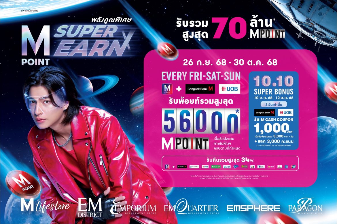 ห้างสรรพสินค้ากลุ่มเดอะมอลล์ ร่วมกับ ธนาคารกรุงเทพ และธนาคารยูโอบี มอบโปรโมชั่นสุดคุ้มคืนกำไรนักช้อป กับแคมเปญ “M POINT SUPER EARN” พลังคูณพิเศษ ระหว่างวันที่ 26 กันยายน – 30 ตุลาคม 2568 สำหรับสมาชิกบัตร M Card และบัตรเครดิต BANGKOK BANK M VISA หรือ บัตรเครดิต UOB รับความคุ้ม ทุกการช้อป รับพ้อยท์รวมสูงสุด 70 ล้าน M Point และ 3 วันสุดปัง กับ 10.10 SUPER BONUS รับ M Cash Coupon 1,000 บาท ที่ ห้างสรรพสินค้าเดอะมอลล์ไลฟ์สโตร์ และเดอะมอลล์ ทุกสาขา, เอ็มโพเรียม, เอ็มควอเทียร์, เอ็มสเฟียร์ และ พารากอน ดีพาร์ทเม้นท์สโตร์ พิเศษกับสิทธิประโยชน์สุดคุ้ม 4 ต่อ อาทิ