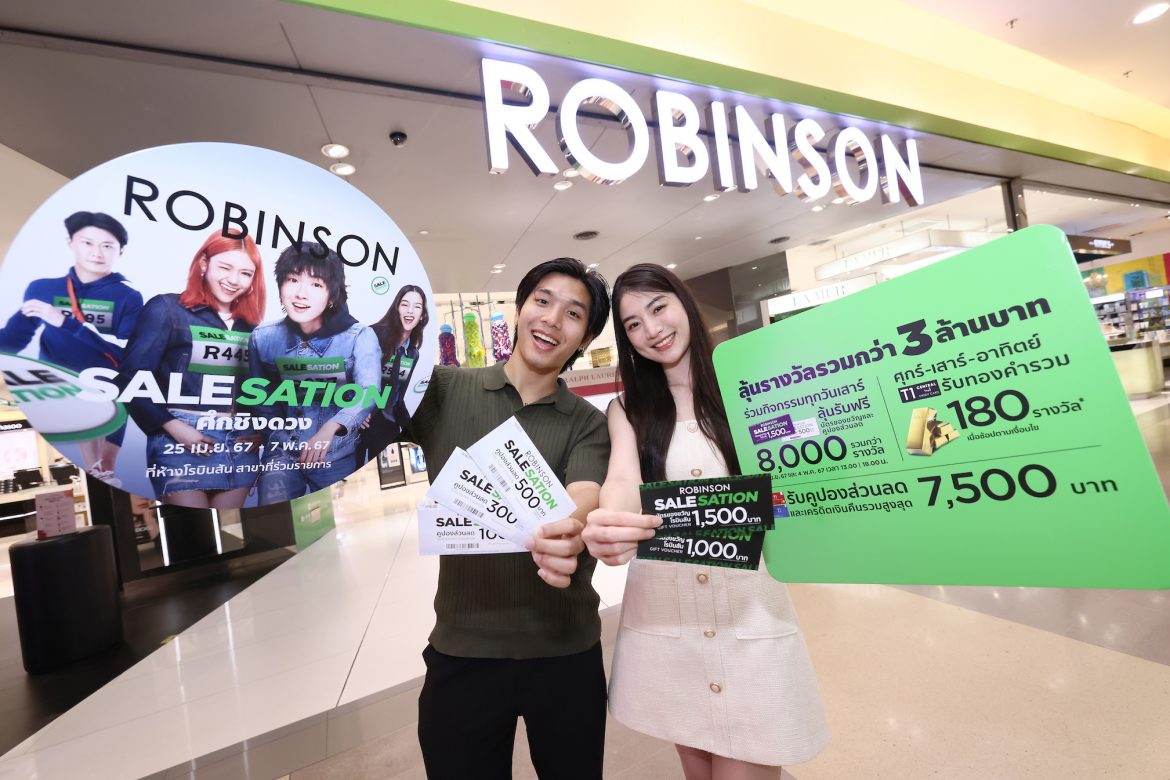 สัมผัสปรากฏการณ์การช้อปปิ้งสุดคุ้มกับซิกเนเจอร์แคมเปญ “ROBINSON SALESATION (โรบินสัน เซลเซชั่น)” ตั้งแต่วันที่ 25 เม.ย. 67 – 7 พ.ค. 67 ที่ห้างโรบินสันทุกสาขา (ยกเว้นสาขาศรีนครินทร์ และจังซีลอนป่าตอง) อีกทั้งยังสามารถช้อปสนุกผ่านหลากหลายช่องทางการช้อปปิ้งสุดสะดวกของห้างฯ ไม่ว่าจะเป็น Robinson Chat & Shop, Robinson Personal Shopper On Demand โทร.1425 ผู้ช่วยส่วนตัวสำหรับทุกคน Central App และเว็บไซต์ www.central.co.thตลอด 24 ชั่วโมง รวมทั้ง Facebook Fanpage: Robinson Department Store