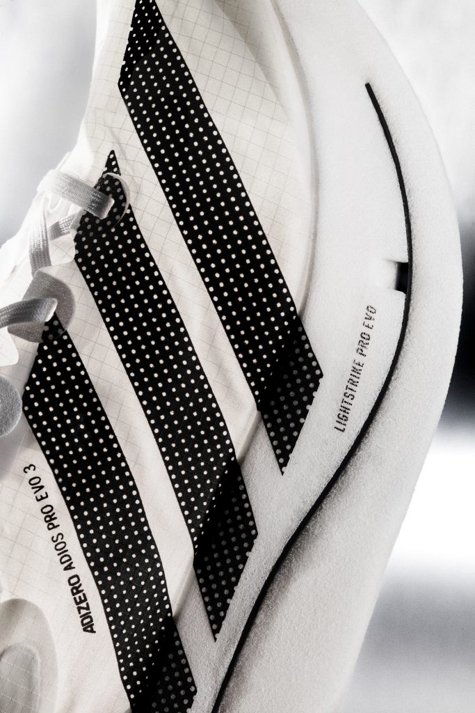 รองเท้าวิ่ง Adizero Adios Pro Evo 3 ถูกสร้างขึ้นมาเพื่อสานต่อการสร้างสถิติใหม่ ซึ่งมีการพัฒนาในระดับก้าวกระโดดจากการสร้างรองเท้าวิ่งสำหรับแข่งขันที่มีน้ำหนักเบากว่า 100 กรัม จึงถือเป็นนิยามใหม่ของจุดสูงสุดของการวิ่งระยะไกลที่สามารถเกิดขึ้นได้จริง