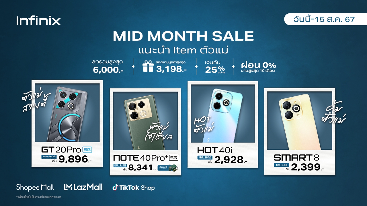 Infinix (อินฟินิกซ์) แบรนด์สมาร์ทโฟนระดับโลกราคาคุ้มค่า ครบครันทุกการใช้งาน และตอบโจทย์ไลฟ์สไตล์คนรุ่นใหม่ จัดโปรเด็ดดีลโดนกับ Mid-Month Promotion ขนทัพทั้งสมาร์ทโฟนและแล็ปท็อปมาเอาใจสายช้อปแบบกระหน่ำรับกลางเดือนที่ร้าน Infinix Official Store บน Shopee, Lazada และ TikTok Shop ตั้งแต่ 13-15 ส.ค. 67 โดยโปรดี ลดรวมสูงสุด 6,000 บาท + ของแถมมูลค่าสูงสุด 3,198 บาท + เงินคืนสูงสุด 25% + ผ่อน 0% นานสูงสุด 10 เดือน